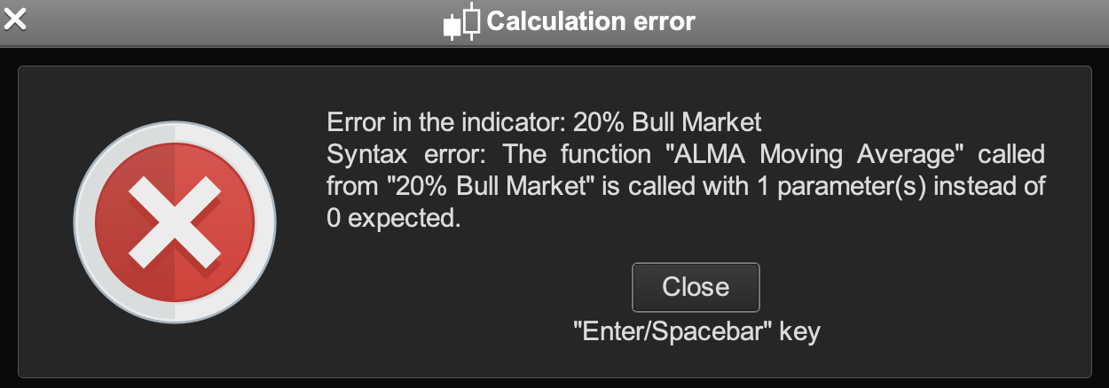 I added the moving averages condition (prices above the 50, 100 and 200 day moving averages) and this worked with a simple moving average but when I added the ALMA moving average I got a warning about the number of parameters called, pls see screenshot: