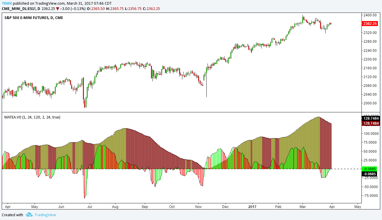 I read the code and this what I understood so far: it’s 2 moving averages differences, smoothed separately with another SMA (just like an old MACD). These 2 curves have different periods to catch the long trend and the short one (this is the 2 black lines). Then histogram are changing their colours, according to their direction: if they are ascending or descending (the 2 MA differences / convergences).