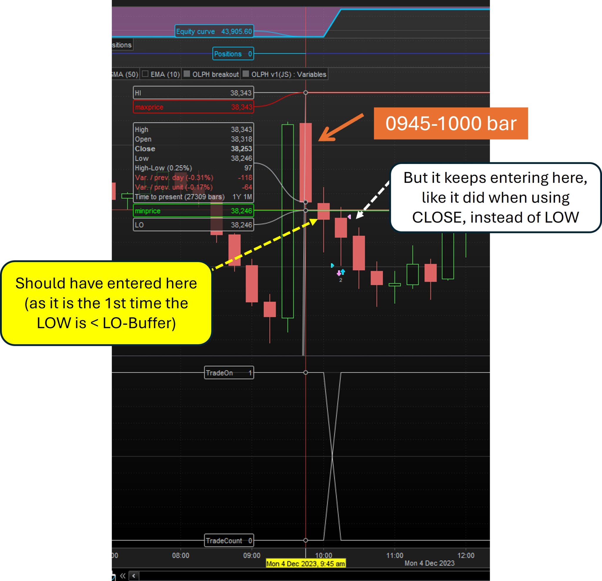 However, the break of HI condition is true while the price is above HI, but then it falls to the close of the bar.