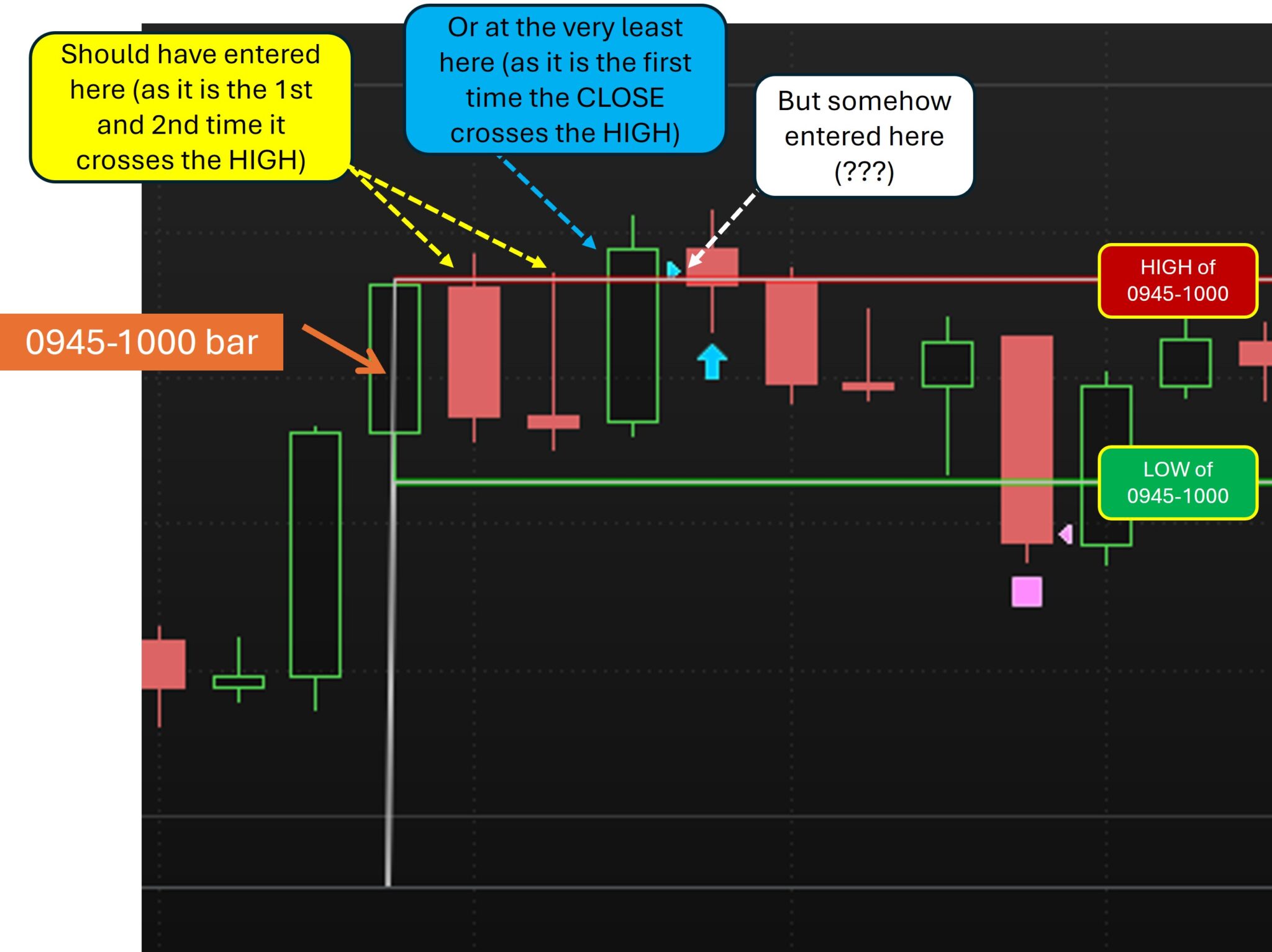 The 100000-101500 bar, opens below HI but wicks up through HI, and here your expecting a order because the trigger condition has been met.