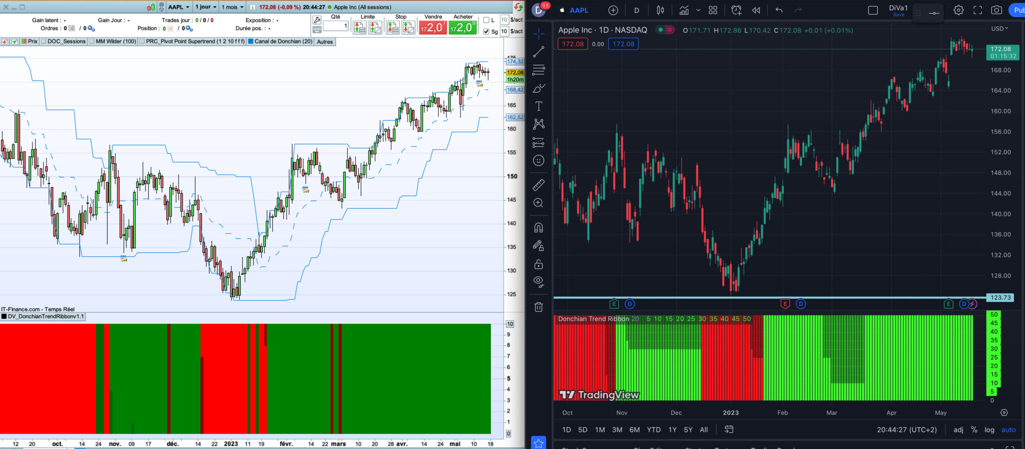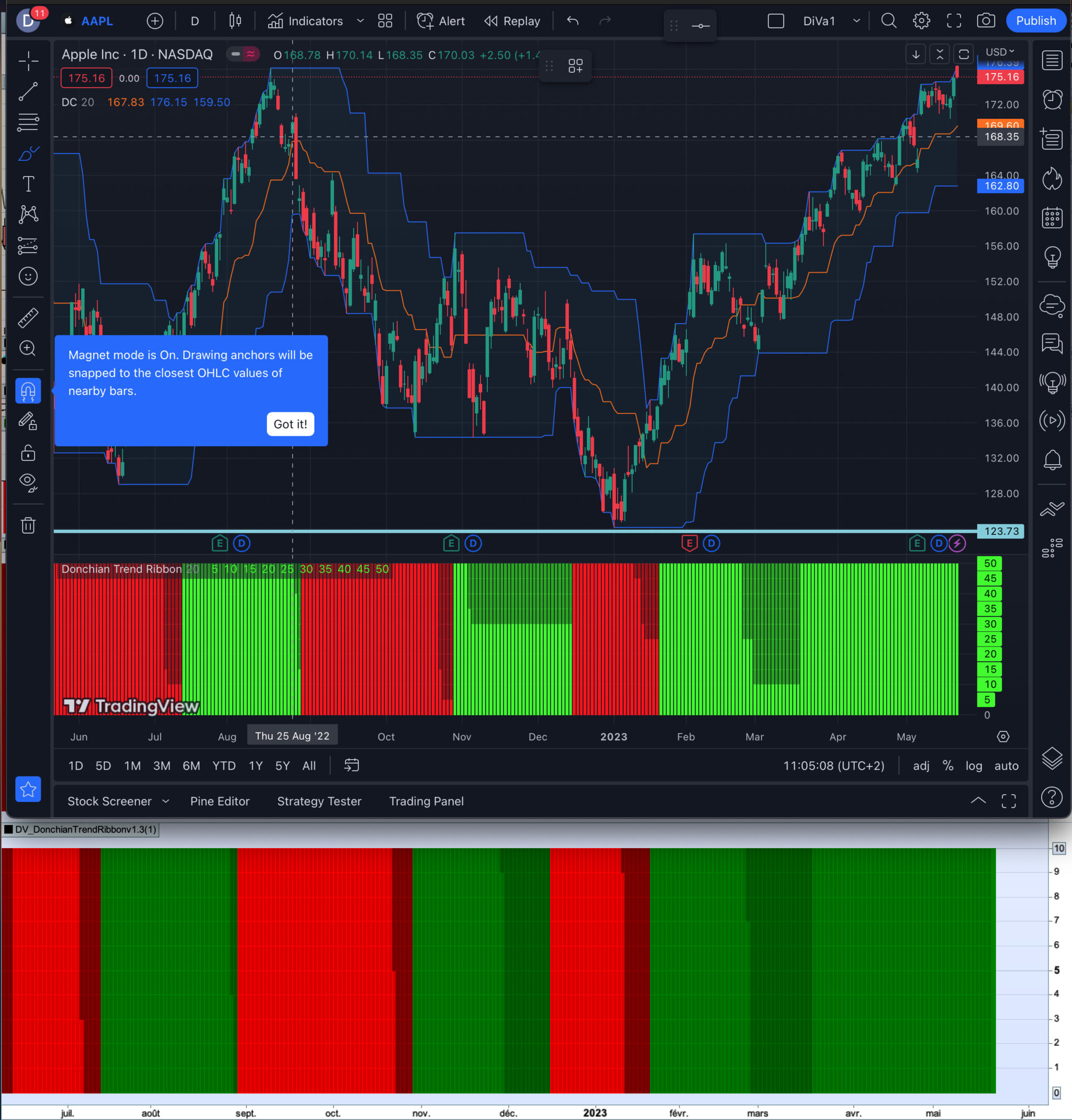 plot(45, color = dchannelalt(dlen – 8, maintrend), style = plot.style_columns, histbase=40)