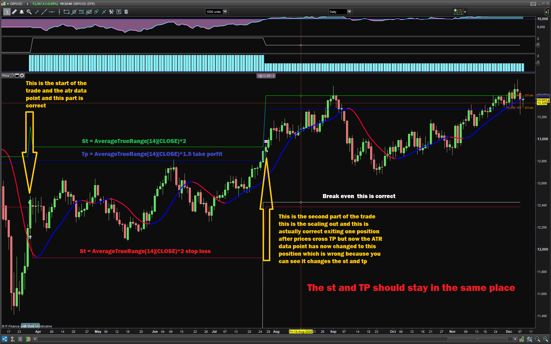 The major problem I am having is the data from the average true range at the beginning of the trade. it takes the right data point from the buy trade price(tradeprice) but the problem comes from the scaling out because that becomes a new (tradeprice) line 34, so that’s a new data point from the ATR which then changes my stop loss my take profit and (St)