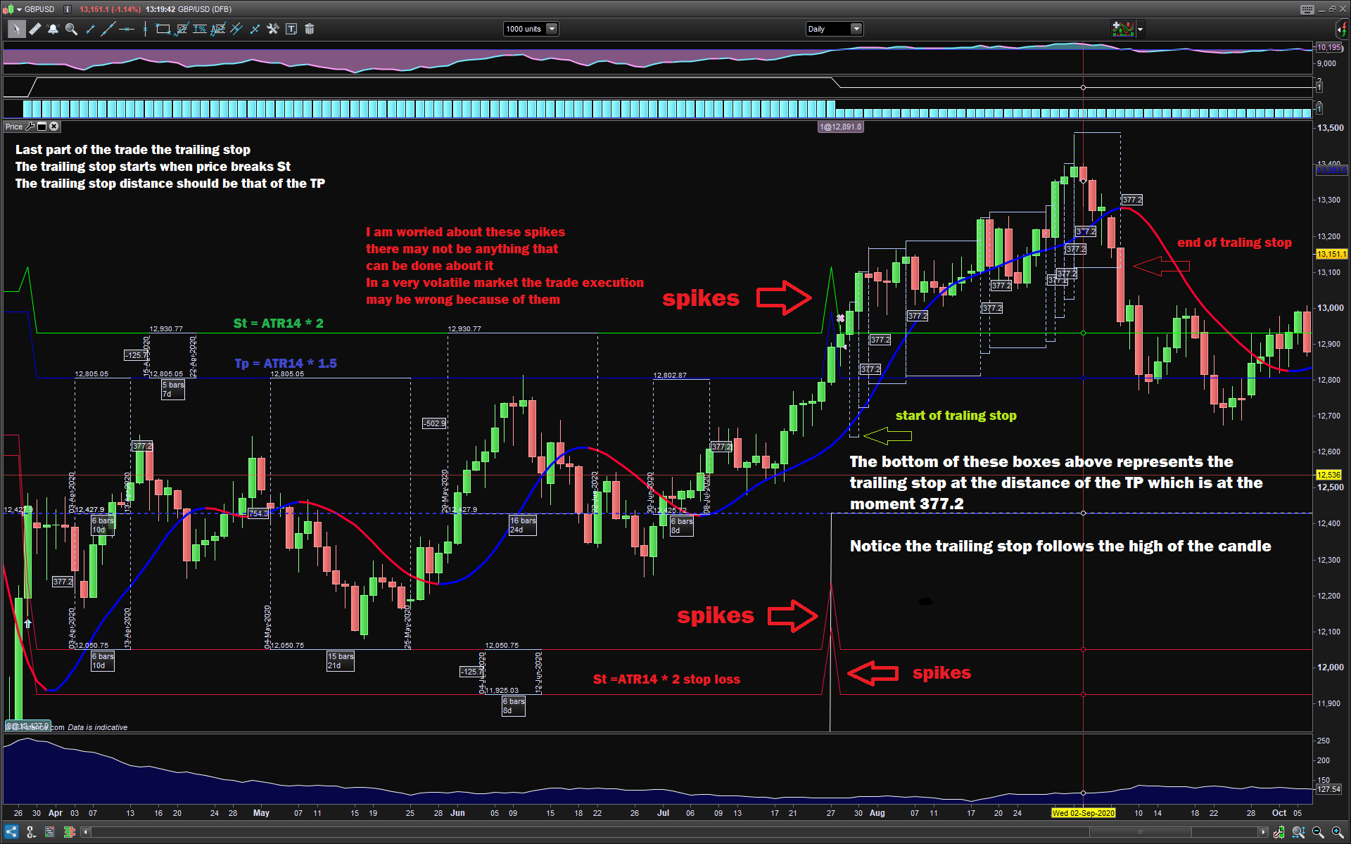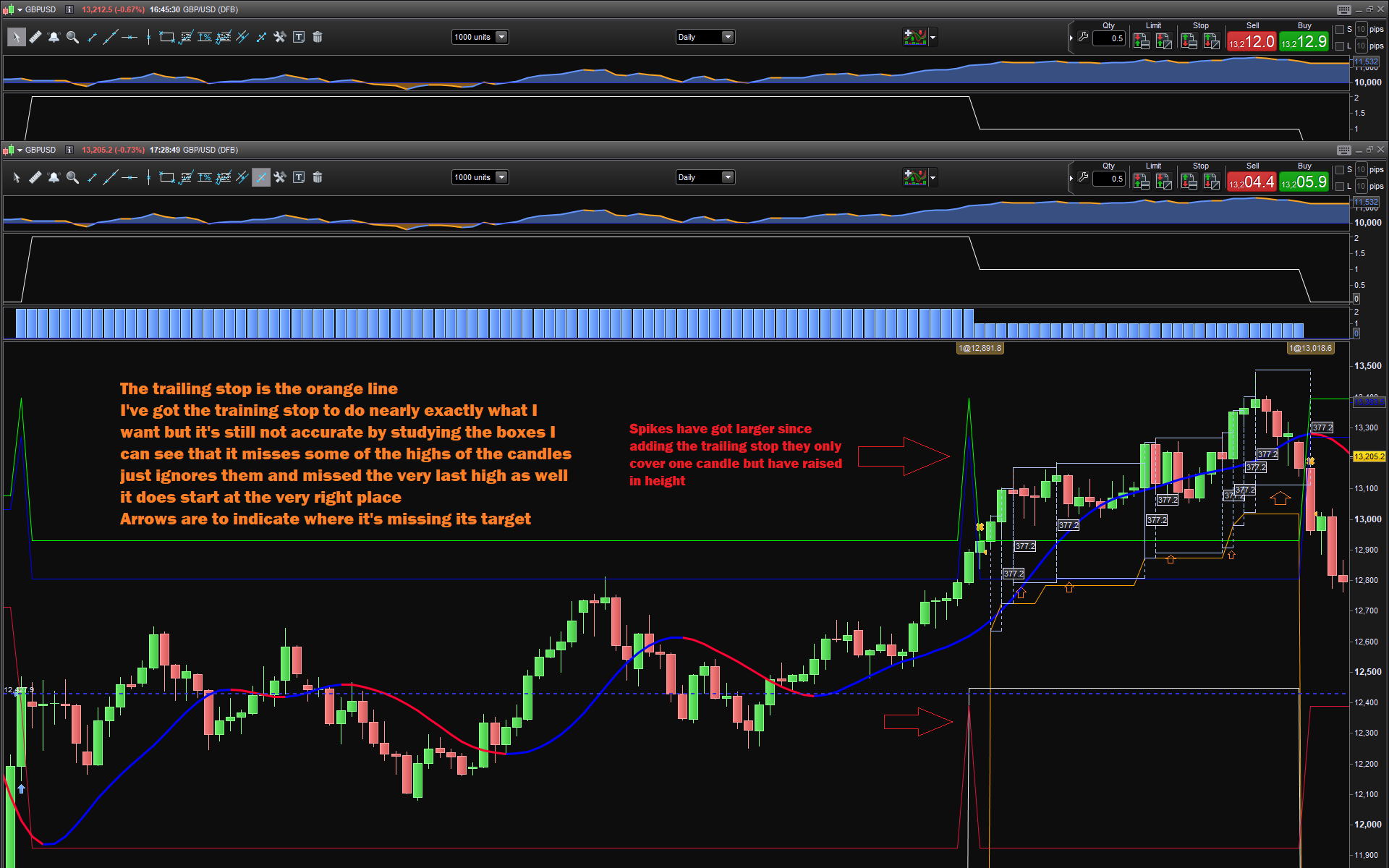 I’ve added a trailing stop to the code it seems to be working alright 90% I’ve added some pictures down below to help explain but the TS and TP there’s some spikes on the chart that worry me a little you might be able to iron them out not sure. The trailing stop is nearly close to perfect but you might be able to make it actually perfect, again I’m not sure so I’ve added 2 pictures and if you take a look it should explain it, The trailing stop is just missing its target or missing a candle altogether