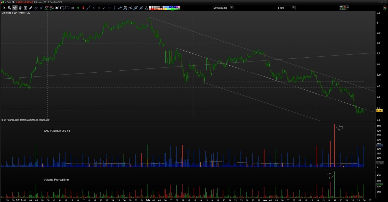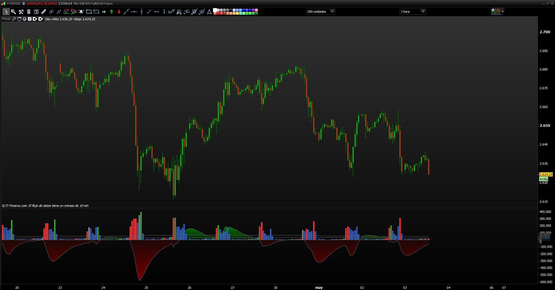 Con esta herramienta el color corresponde con la oferta y la demanda que en ocasiones puede coincidir con el color de la vela. Si añades el volumen de Prorealtime junto a esta herramienta