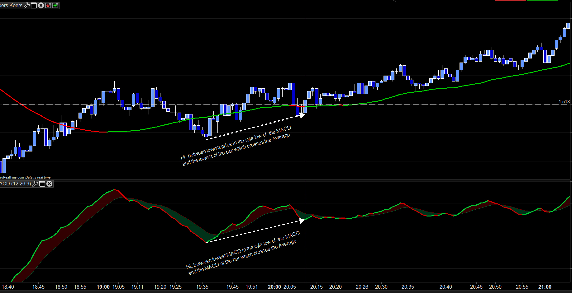 With help from Vonasi (many many thanks) I developed an indicator which shows higher lows and lower highs in the MACD in sync with higher lows from bars which cross the Averge line. You are able set your personal Average and personal MACD.