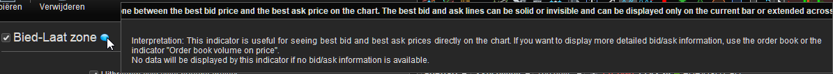 Also please see the 2nd picture below, which is the help-balloon for the Bid/Ask band (zone) indicator, which talks about two other possibilities. I am not sure any more whether you need to pay for both (more difficult to check for me as I pay for them so I have them available anyway. The thing to obtain would be the subscription to the orderbook (which is buried very deep in the ProRealTime pages – not the normal subscription but as a plug-in) and I recall that the indicator “Orderbook Volume on Price” is slipstreamed with it.