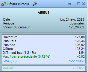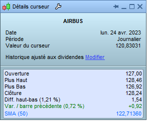 Le titre Airbus a distribué des dividendes le 25/04/2023 (1,80 €) mais les cours avec ajustement sont identiques aux cours sans ajustement.