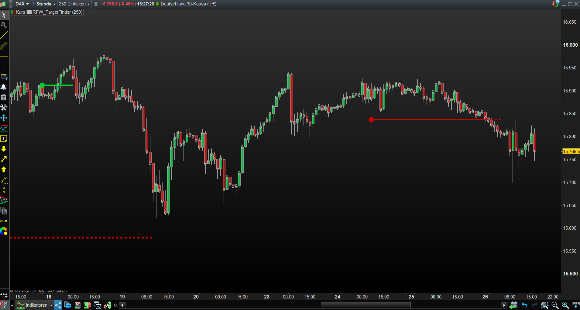 ….wieder aufgegriffen. Mein Indikator funktioniert nun prima was Kkurszielprojektioinen betrifft, bis jedoch die Segments-Einzeichnung hinsichtlich der rechten Länge, siehe anhängender Screenshot. Die rote DottedLine indiziert in diesem Fall das offene Short-Kursziel bei 15.580 und sollte eigentlich am letzten Bar enden. Wird das Kursziel erreicht, wird aus der dotted eine durchgezogene Linie, wie 2mal im Screenshot erkennbar.