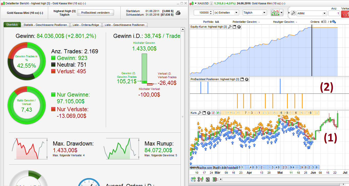 Wenn ich statt (close) , (high bzw. low) eingebe, zeigt er mir keinen einzigen Trade? Und im Chart zeigt er mir tausende Pfeile (1) an aber im mittlerem Fenster (2) sind nur ganz wenige Entry`s aufgelistet.