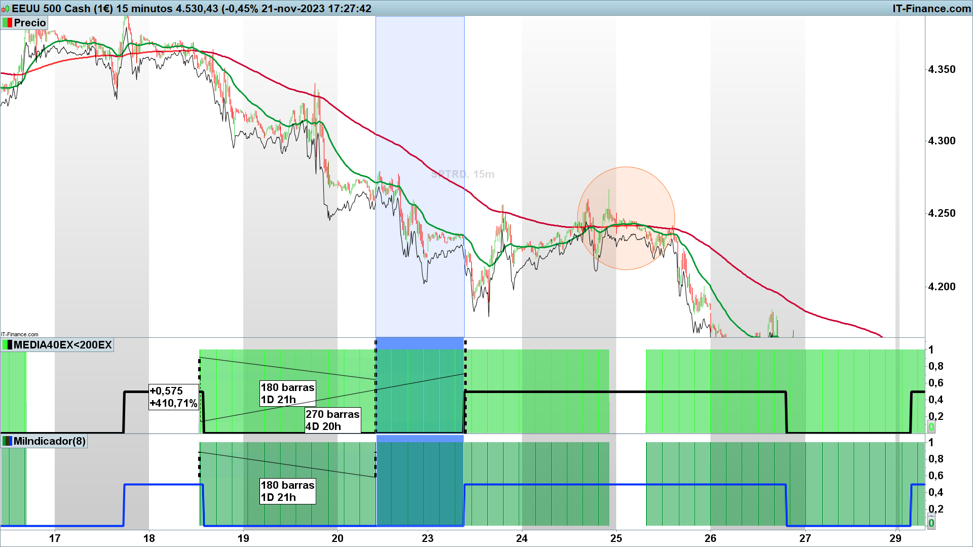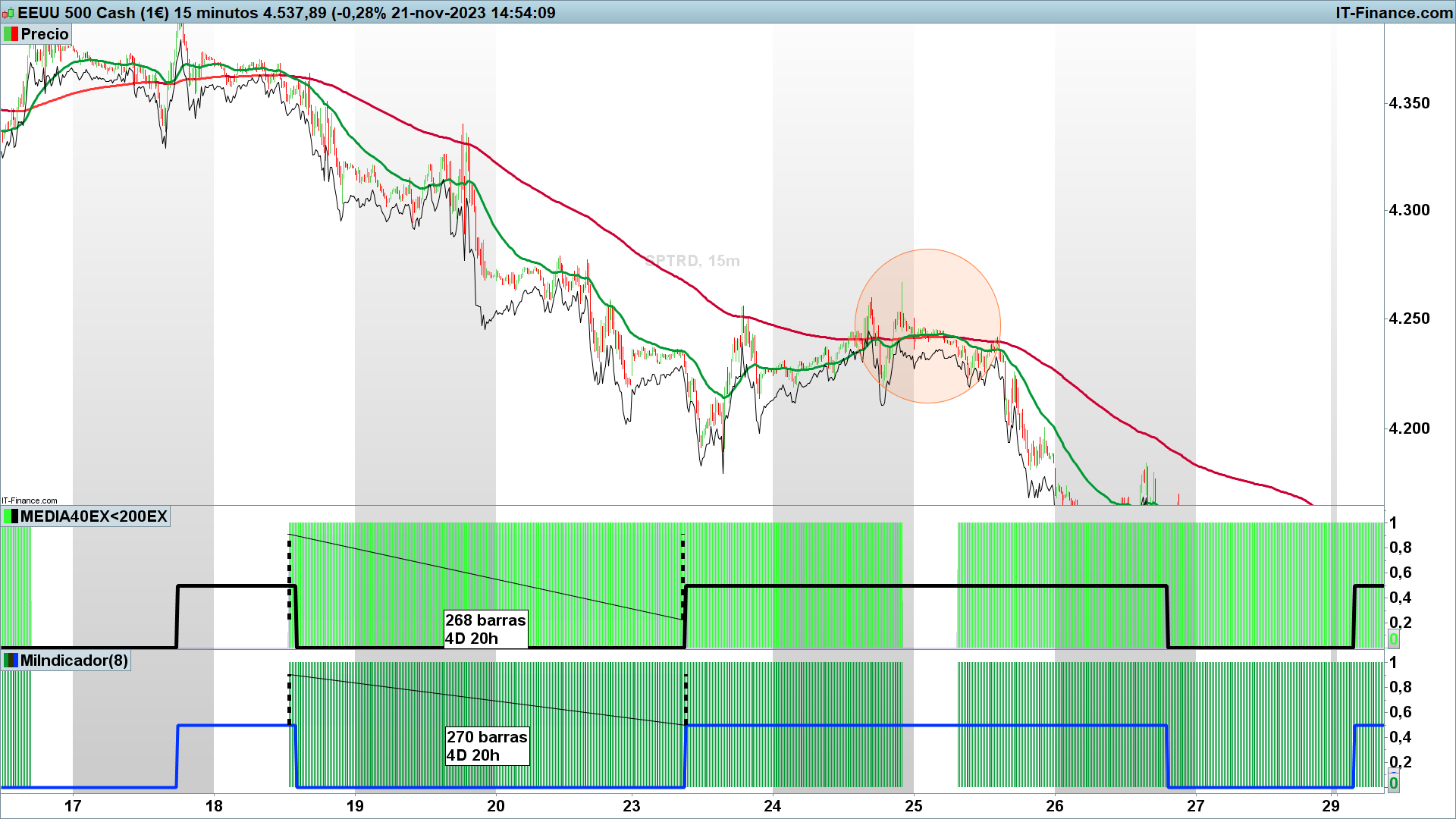 Debería de marcarse a partir de 180 velas desde que la 40EMA cruzo a la baja la 200EMA y hasta 270 velas después o bien la vuelva a cruzar al alza, lo que se produzca primero.