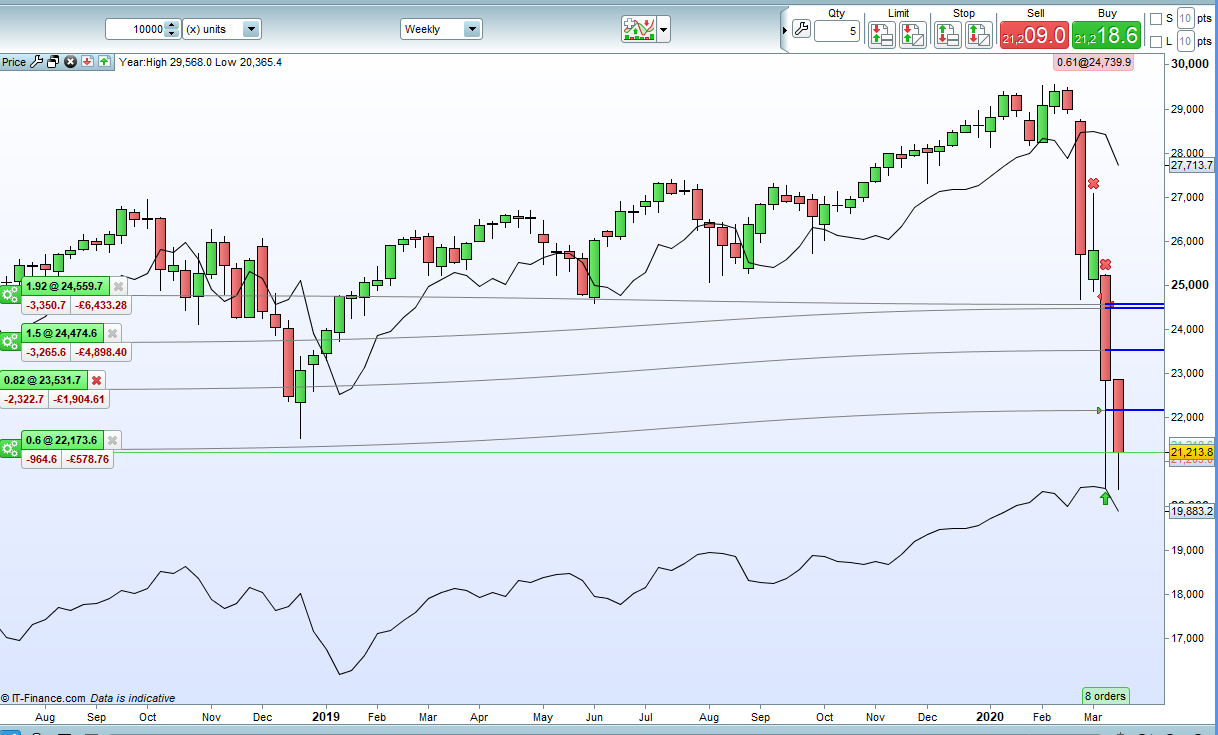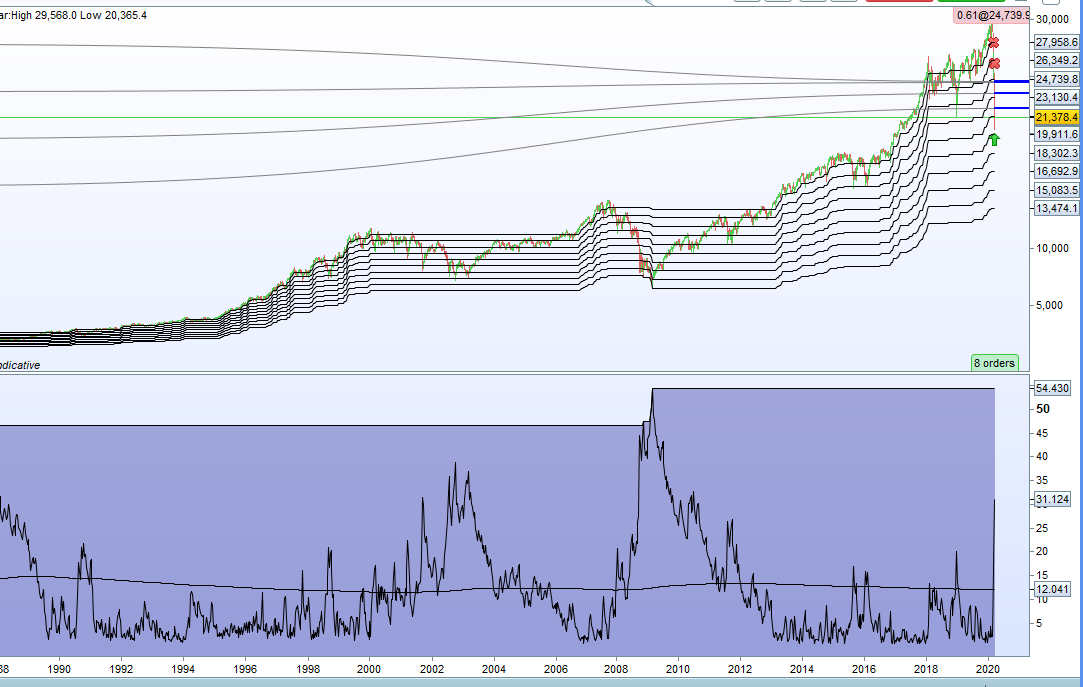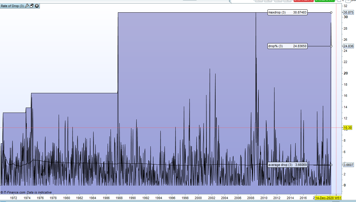 Interestingly the biggest drop in 3 bars on the weekly chart was recorded in the 1987 crash at just under a 31% drop. This was then repeated in 2008 and then last week we closed out with a three week drop of 29%.
