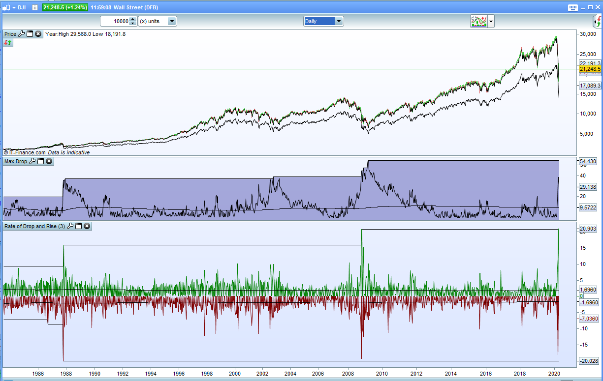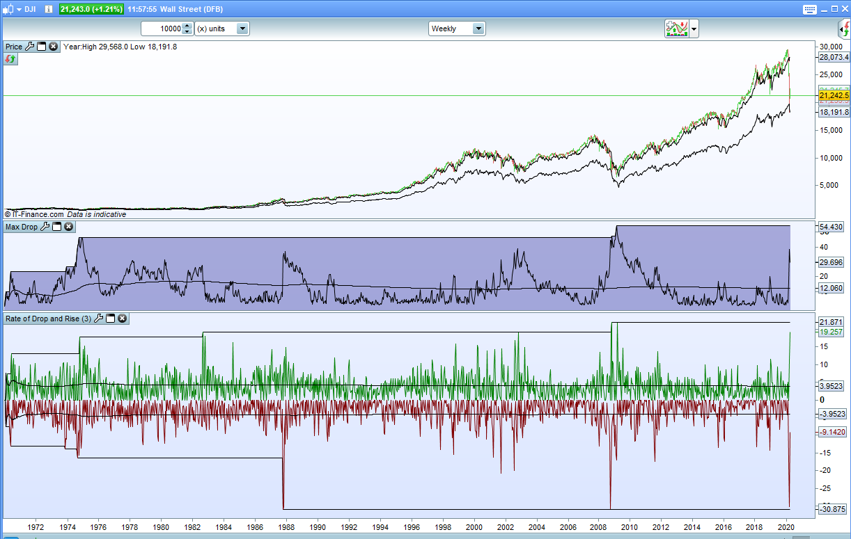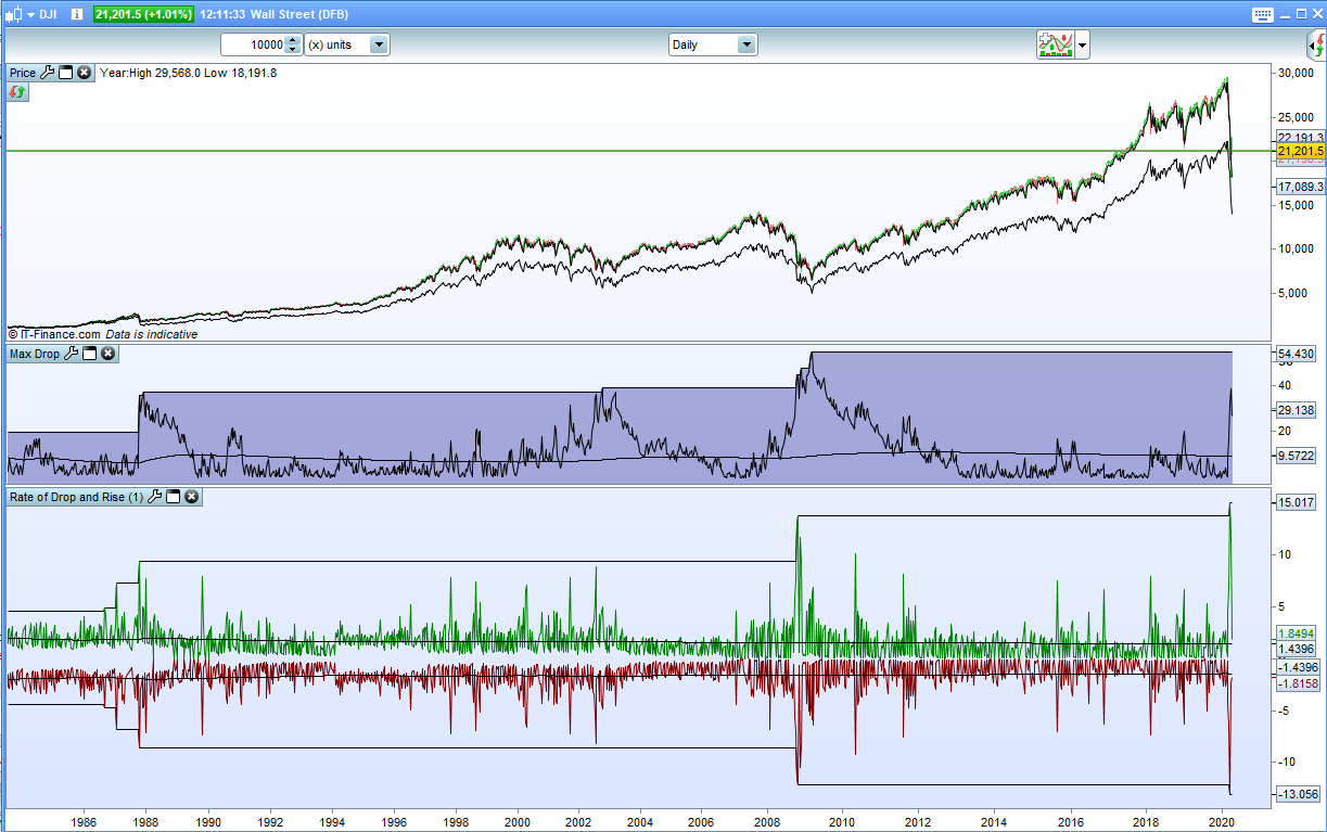 The images show the Dow Jones weekly and daily with rate of drop and rise in 3 weeks and 3 days plotted in the first two images. It seems that this is not really an out of the ordinary crash. The DJI did manage a new biggest rise % in a 3 day period but only just. The market did however manage to create new all time record for the biggest percentage drop for a single one day candle.
