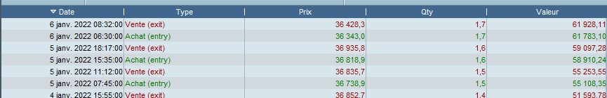 I checked the position size. For the last trade it’s 1.7 lots and the second to last one it’s 1.6 lots. So, if I take last trade 145/1.7=85 <> 80 shown on the backtest. Second to last trade (5 jan. 15:35) : 187/1.6=116 <> 74.