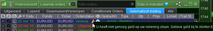 Rejected orders will show an orange triangle, click on it and a descriptive text which usually tells sufficiently what happened. In my case I had to add money. 😉