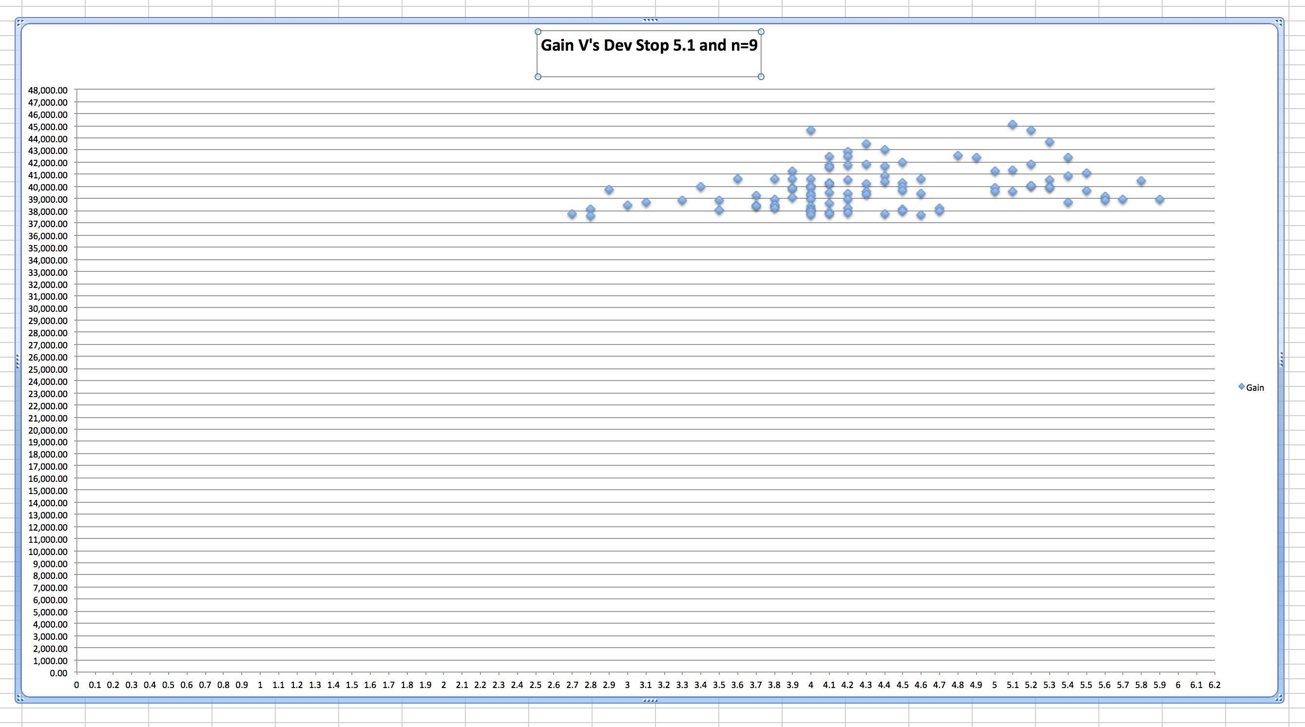This Excel, gain versus Dev Stop, shows a great level of stability with this particular entry/exit pairing for this asset: Pls see screen. NOTE: This is still a mean reverting system so you might want to code in a hard stop in case the entry gets you in on the wrong side of a sustained opposite directional move.