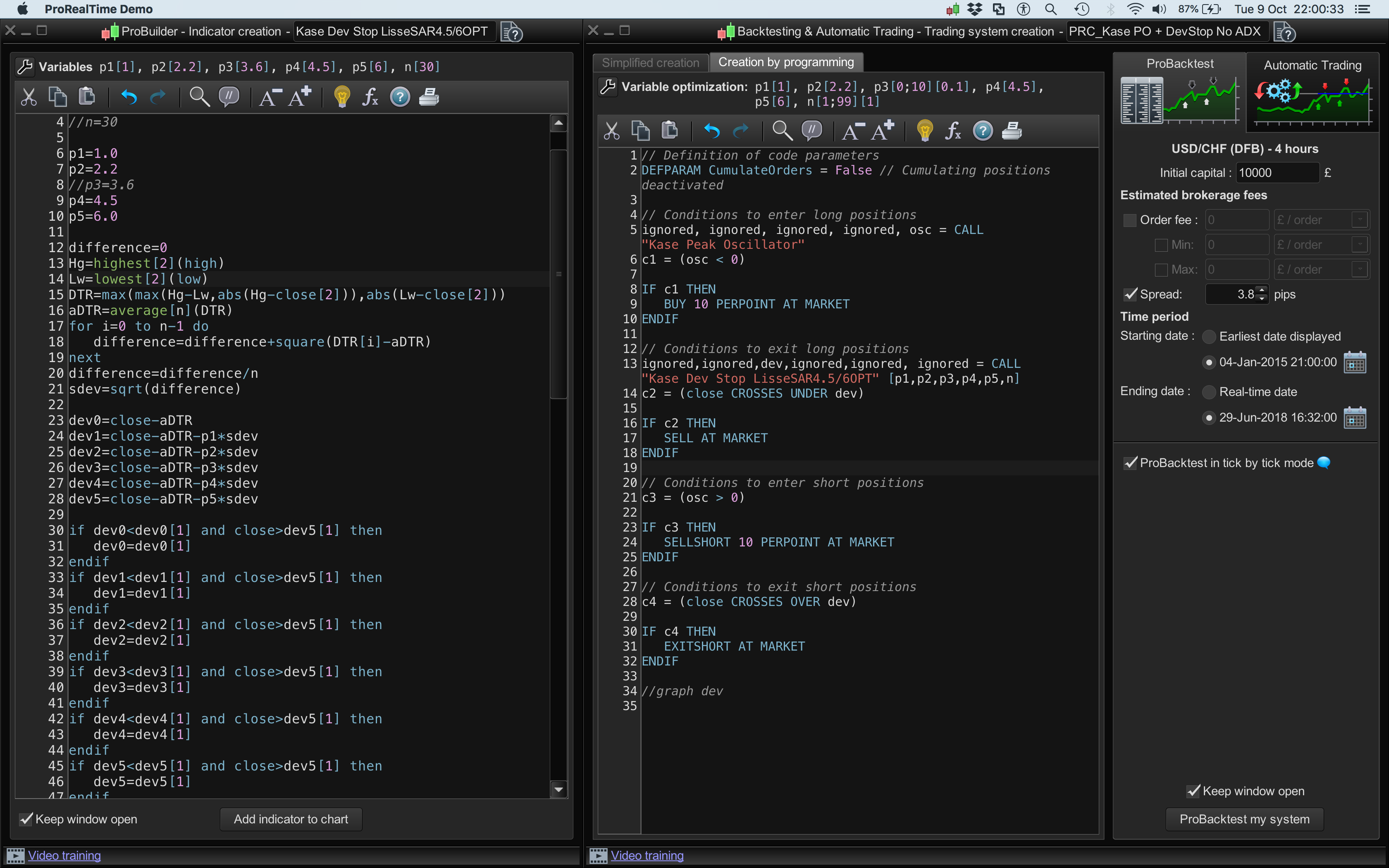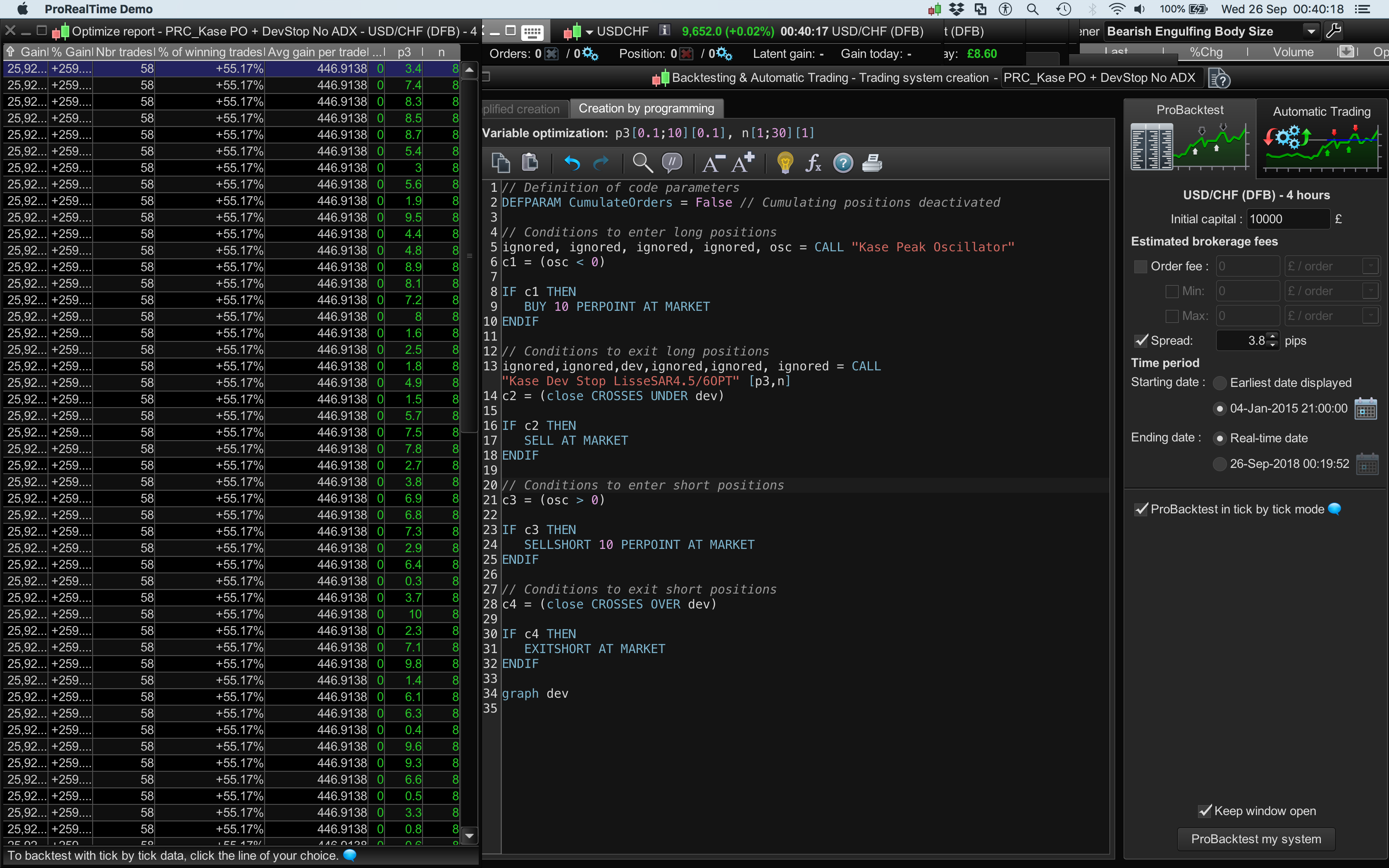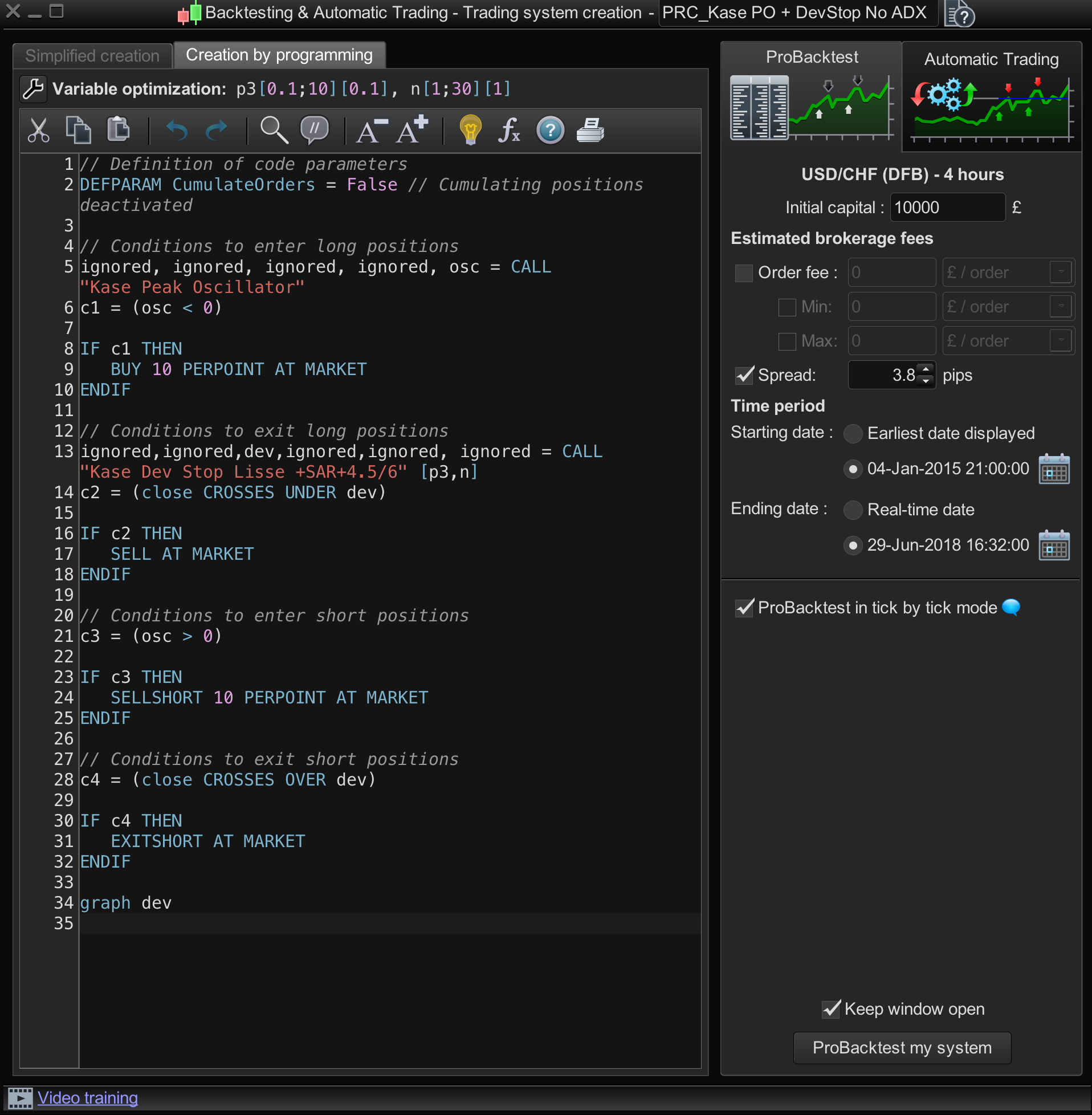 The PRC strategy didn’t work for me (once I REM’d the p2 and n values in the indicator code and optimised the p2 and n in the variable optimisation window), in that it gave a profit of £8,612k on the 4 hour Swissy, (4th Jan 2015 – 29th June 2018), when I know manually using different dev stops made more profit as the screenshot I posted earlier shows: https://www.prorealcode.com/topic/how-do-you-optimise-atr-stops-around-price/page/2/#post-80533.