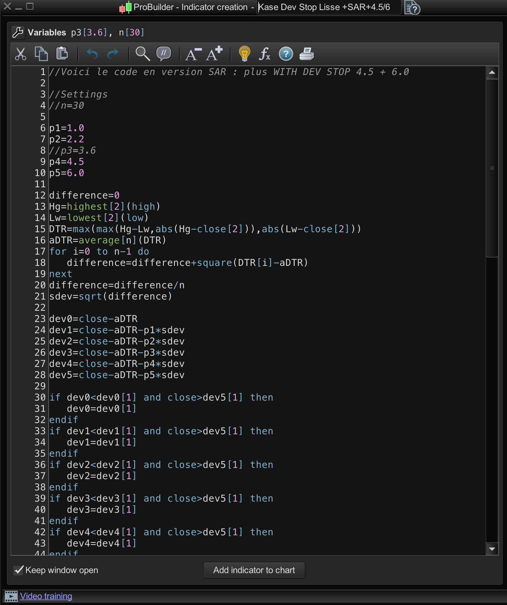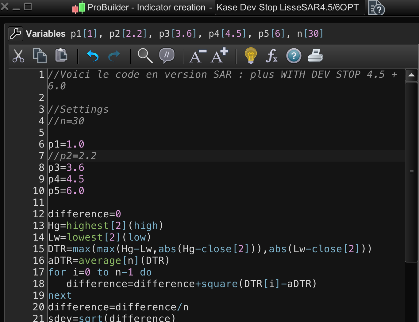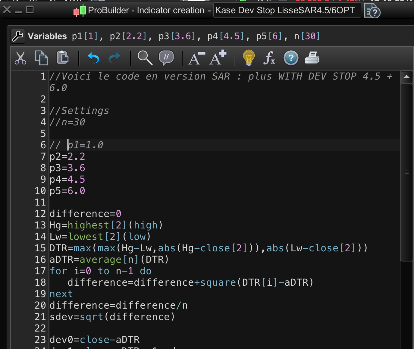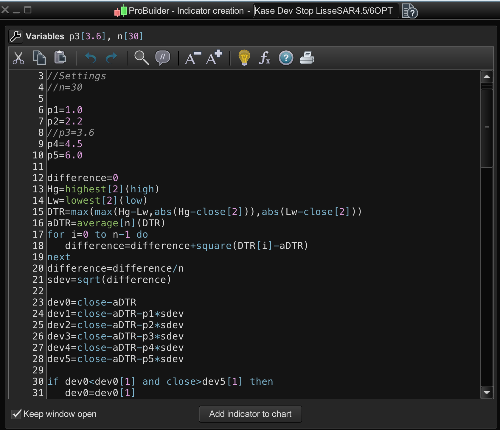 In the Kase Dev Stop indicator the variables used were “p2” (2.,2 std devs) and n = 30 default. In the code I REM’d out these settings to optimise them: