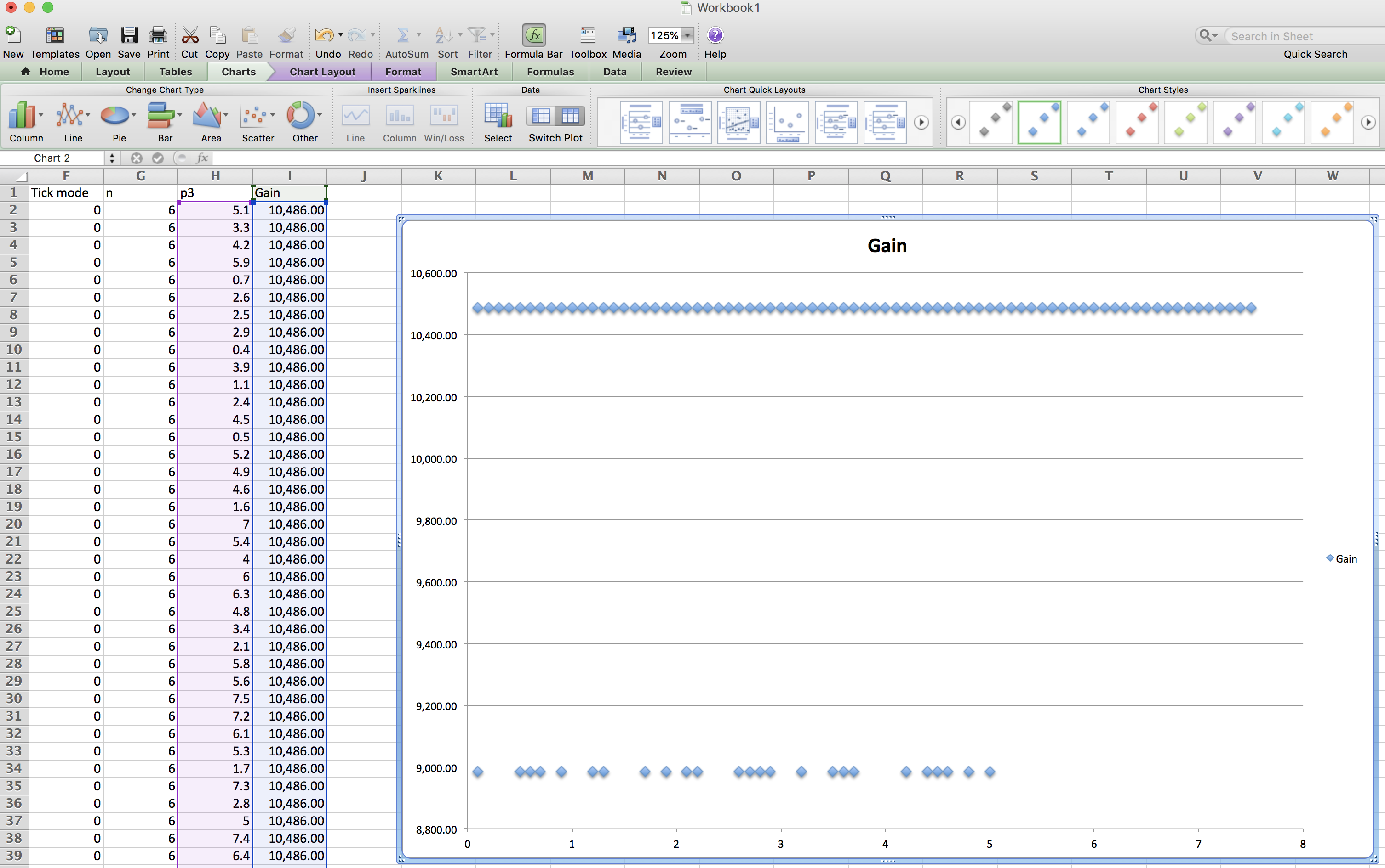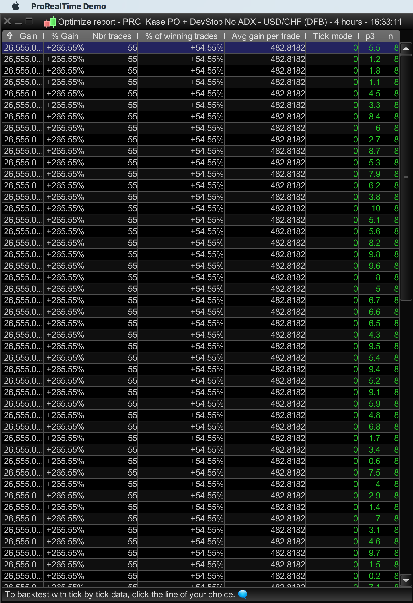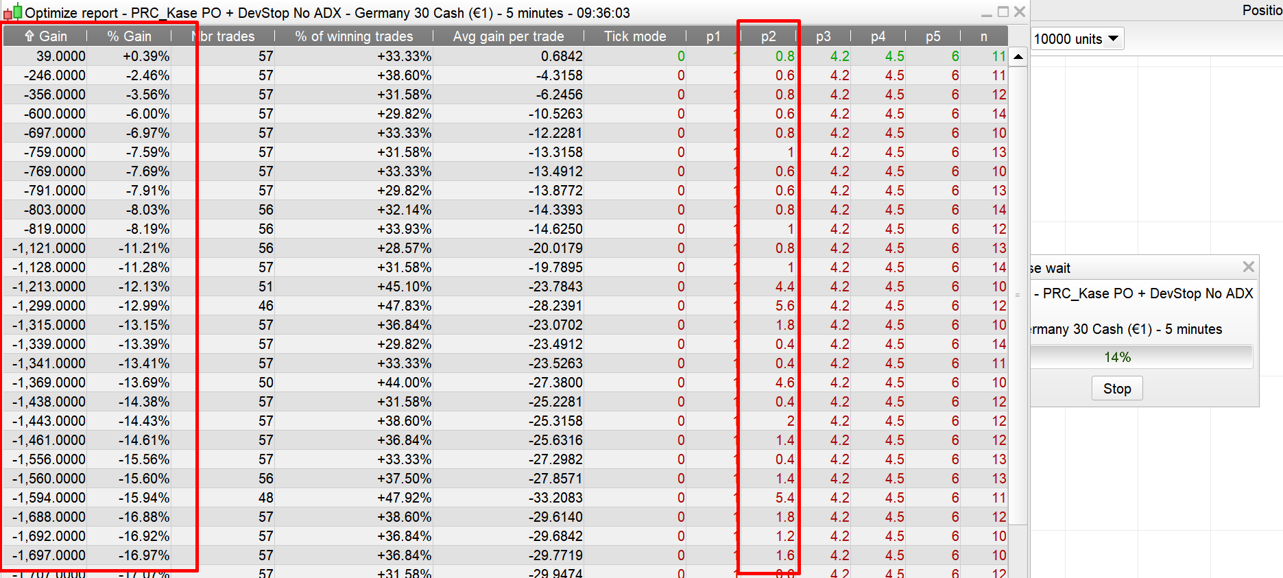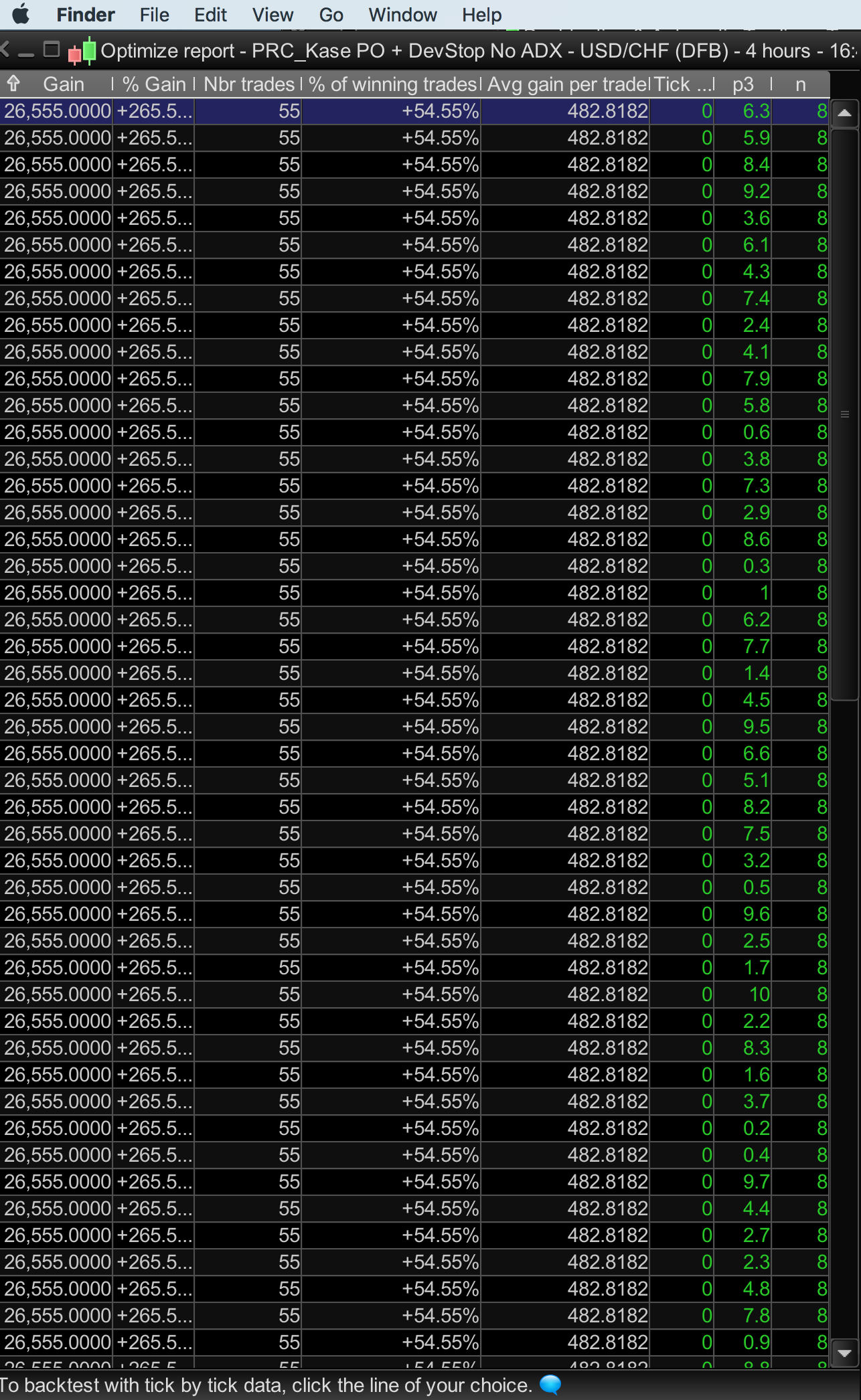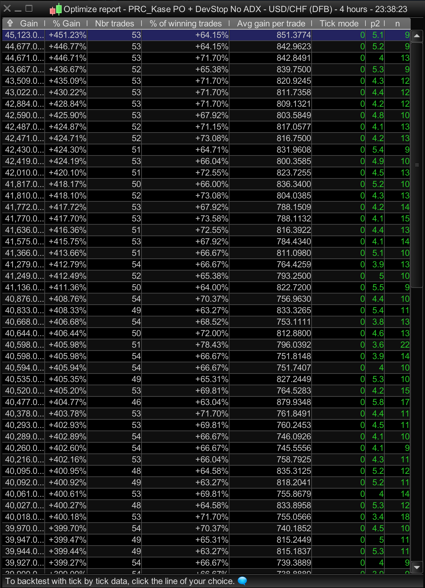 There was a variation of where a “+” sign was placed in the name of the Kase Dev Stop indicator called by the system and that called a very similar version of the indicator but one which didn’t have the correct variables for optimisation… however the results of different Kase Dev Stop exits (on the 1 hours Swissy ) still produces multiple results with the same profit, eg £10,486, for many different p3 std deviation settings (I tested std deviations from 0.1 to 7.5 in steps of 0.1)? Pls see screen: Does anyone know why it is doing this? That top line of £10k profit in the Excel reflects the p3 column to the left, in that there are a wide range of p3 std deviation values that ALL make £10k? Huh?