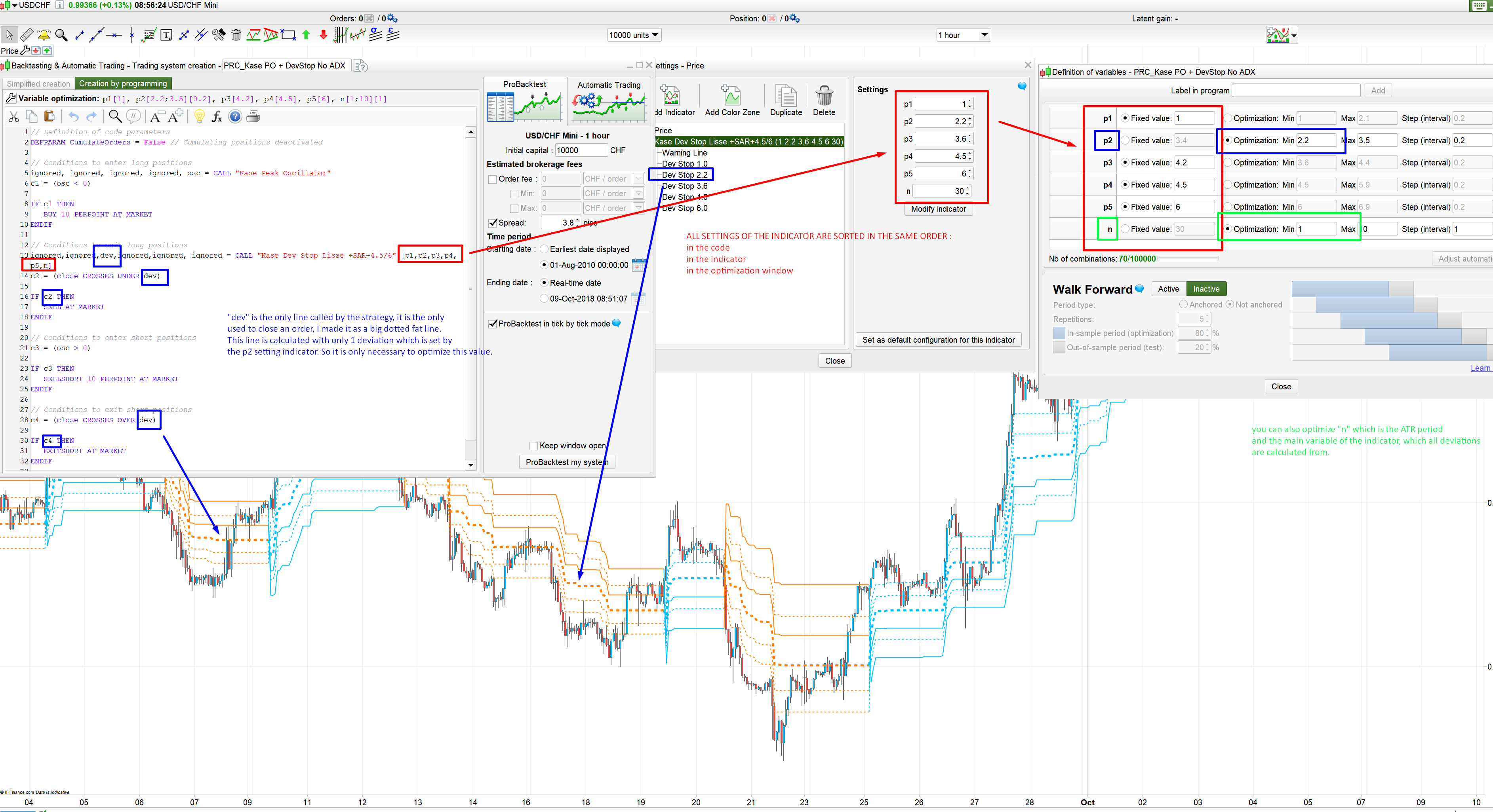 • “dev” is the only line called by the strategy, it is the only one used to close an order currently running, I made it as a big dotted fat line in the “lisse” indicator. This line is calculated with only 1 deviation parameter which is set by the p2 setting in the indicator. So it is only necessary to optimize this value, not the others.