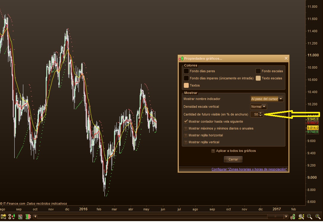 Hi, if you mean future price, right click on main chart, choose “chart properties” and change default value of 3% to your desired (See image below)