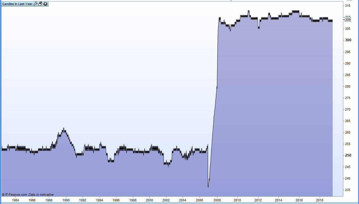 It gets me thinking that when we use something like a common 200 period average for a decision in a strategy this average represents a totally different thing pre 2007 when there were 5 bars per week compared to post 2007 when there were 6 bars per week – and yet we run back test and develop strategies using it. Really we should use a 200 period average pre 2007 and a 240 period average post 2007 as 6 bars is a 20% increase on 5 bars.