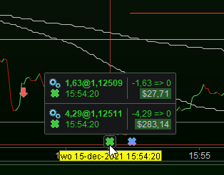 First of all you see an exit which can’t be improved upon. That is, not if I tell you that the Short (red arrow) is additional and waiting longer would imply a loss on that additional purchase (see peak at 15:55). Now, key here is the profit of a total of USD 310 while the TP is set at 160 minimum. Thus, when the system thinks all things will turn bad, it is allowed to exist at 160 or more (there is much more to it, but for this store it’s fine). This thus means that the 310 was reached by trailing only. Well, look at the bottom graph of the price and the green exit cross. Isn’t it totally easy to see that the exist should be there … after we know all the facts ? (hence looking at the remainder of the graph, only ocurring later). Isn’t it also a kind of obvious that you can do this only with about real-time responses (like the 1 second TF) ? … Of course trading at the tick level would even be better, but that’s for V12 (ahem, hopefully).