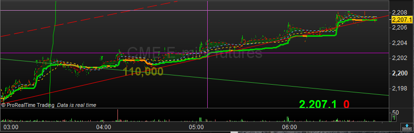 In the 2nd attachment I hope to show what I mean – a very normal thing. This is a M5 Future and the larger trend is obviously upwards. This is what most people would work with, with possible action at 03:00 there. But working at the seconds level you see numerous mini trends. For example, starting at 03:00 I see 13 of them at least, each lasting 20-25 minutes. This is typically what I work with, thus implying 20-25 trades, unless the profit against the Spread is insufficient per trade – then it could be one large only (likely in this case because it looks nicer than it is (very low volatility because night time). 3rd attachment shows the same in S2.