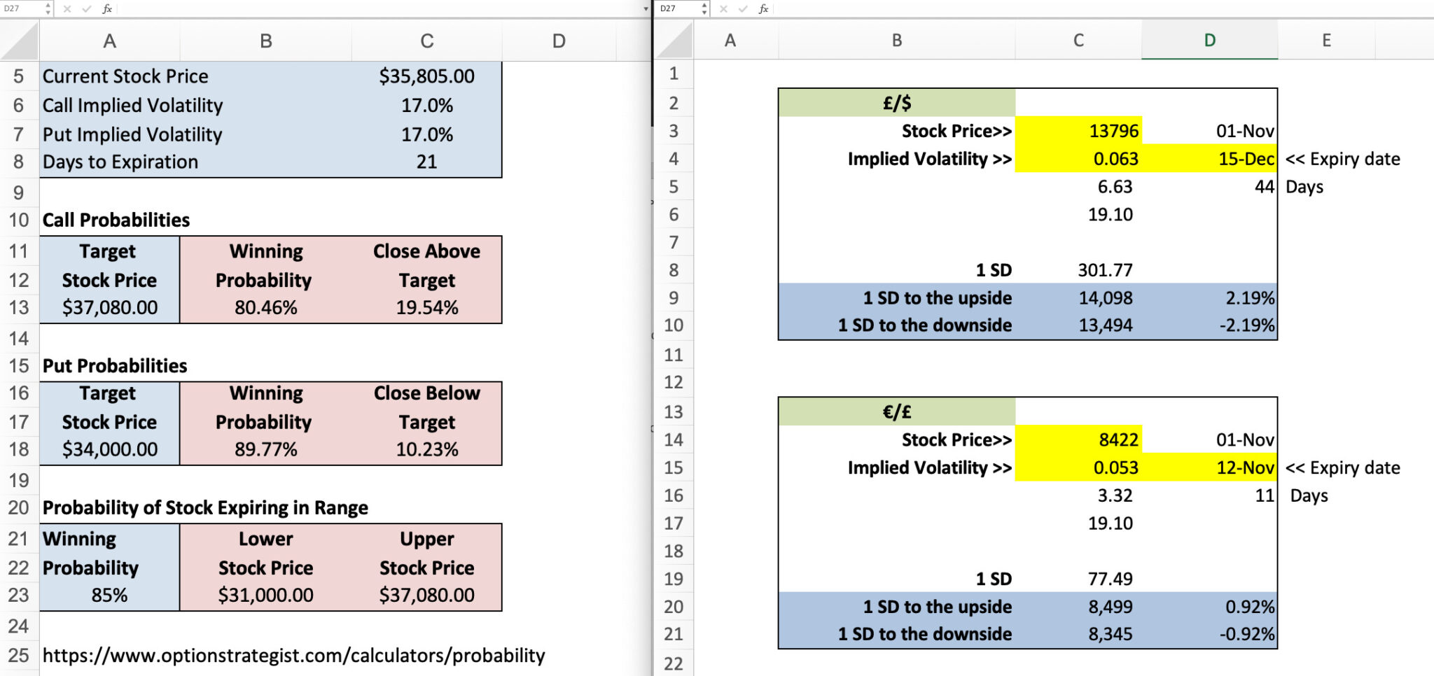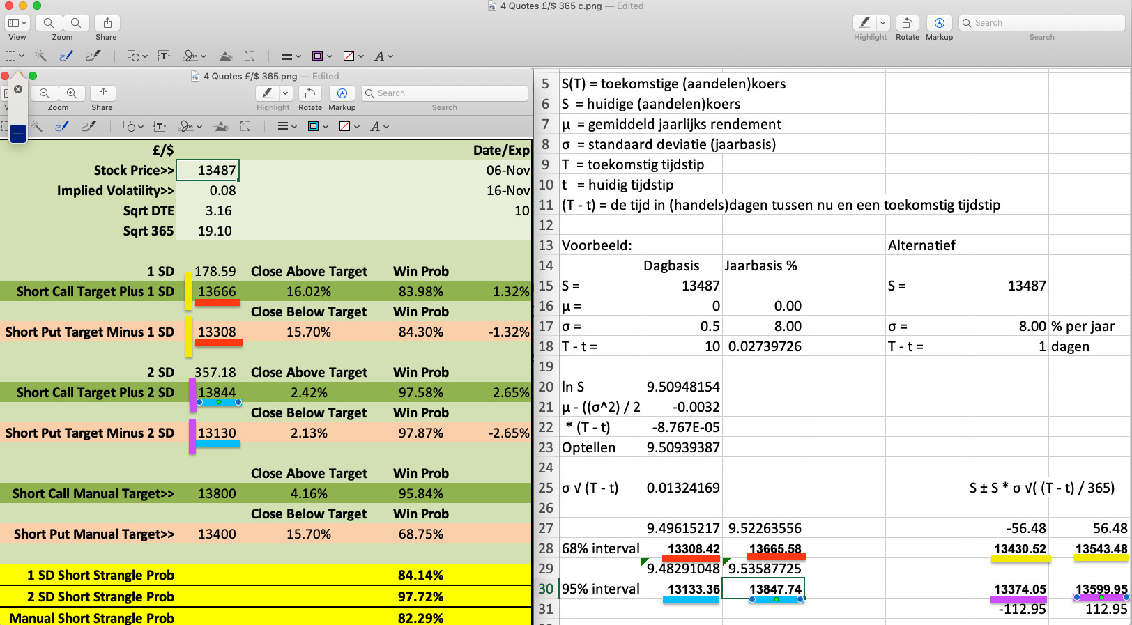 I was going to input your formulas in to a probability calculator I posted earlier but notice there is a lot of difference between your 1SD and 2SD values and those I am getting if I use the conventional calculation (Price x Volatility x SQRT 10/365 (I changed yours from 252 to 365)) in my own sheet it gives different 1SD and 2SD values (by 200 ticks) to those values in your right hand bottom side formula in your sheet? Pls see screenshot of your file with £/$ values below.