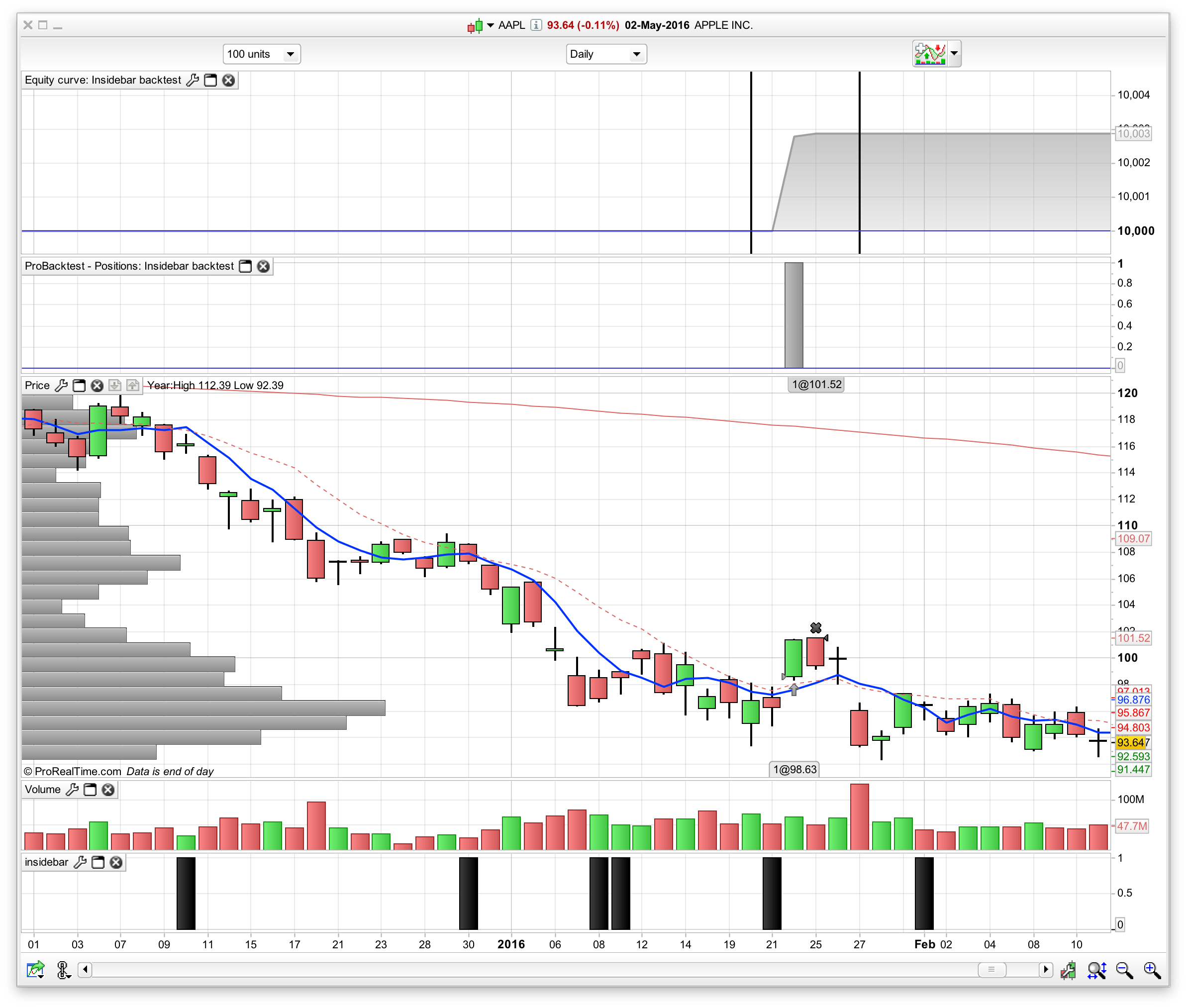 Then I wrote backtest for it. We buy the open of next day after an Insidebar indicator, and only thing I need is the exit of position on same day at 30 min before close.