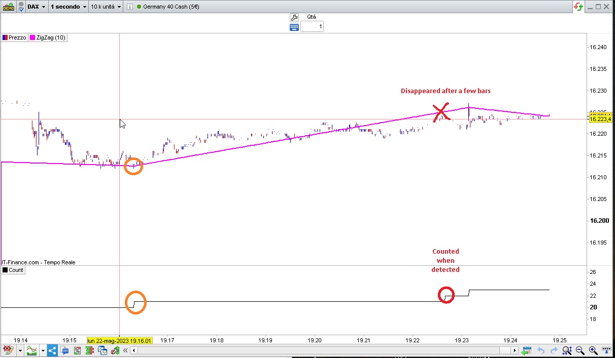 Thirdly, you can count swing points with this code, but it’s useless as it’s a repainting, so it may change any swing point several bars after they have already been counted as you will easily spot on a 1-second TF (see my attached pic):