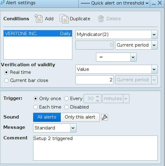 If you want to set alerts that work even when the platform is closed (via email or SMS), the alert conditions must reference predefined, built-in indicators—not custom-coded ones.