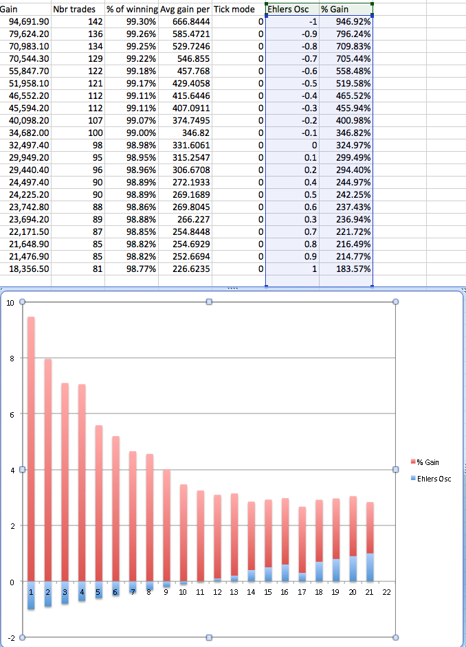 Ideally a 3-d graph of gains v’s drawdowns and the optimised parameter would be necessary to give a good indication for profitable out of sample trading. Note: the Ehler’s Osc values on the x axis from 1 to 21 refers to the table values from -1 across to +1, — although I’m not sure the gain chart is correct as the profit in the tables did rise in lock step with the Oscillator values going from 1 to -1.