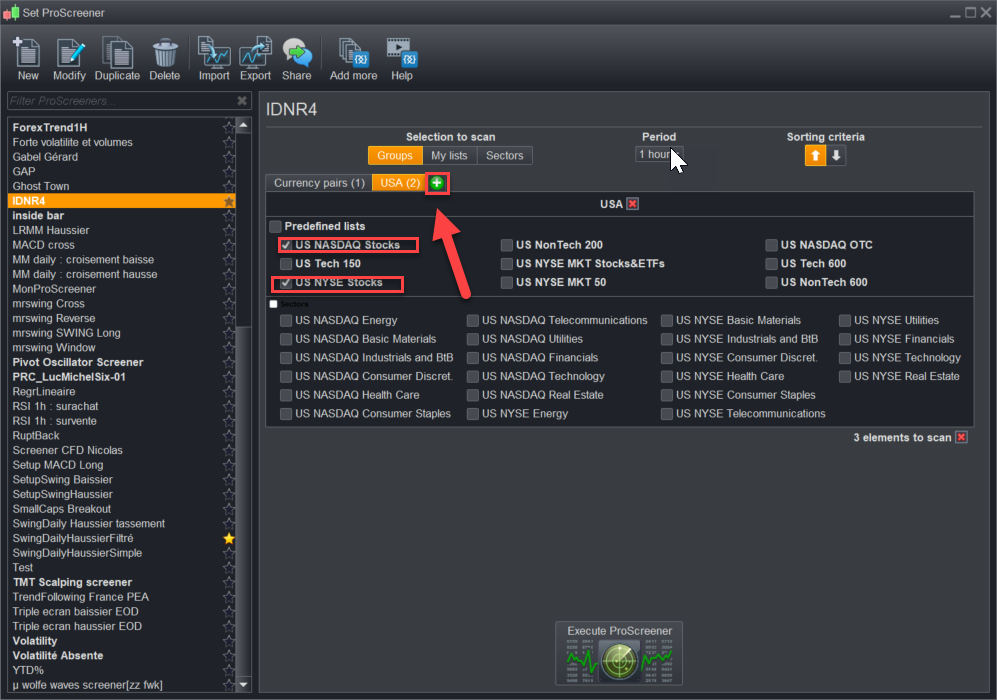 In the ProScreener window, click on + symbol and check the boxes of NASDAQ and NYSE stocks (like I did in the attached picture).