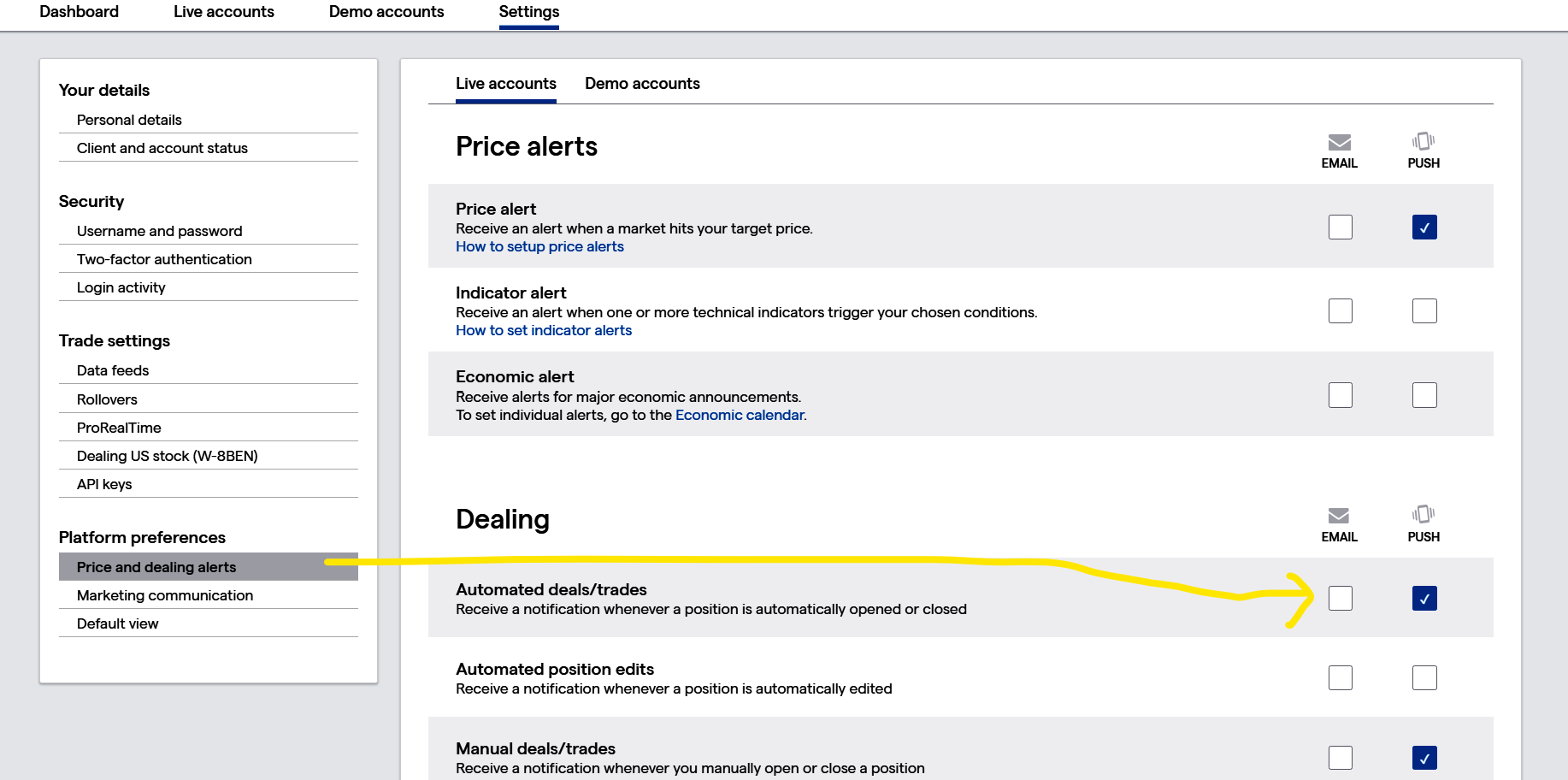 We can receive an email or notification when a position opens or closes using settings on our IG Dashboard … see attached at yellow arrowhead