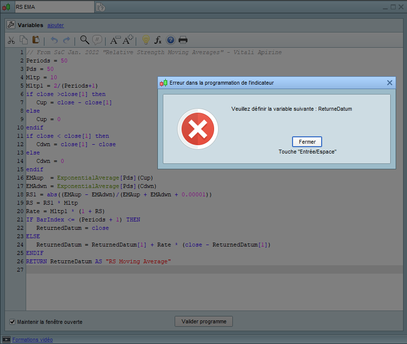 From the article “Relative Strength Moving Averages ” in the latest issue of Stocks & Commodities Jan 2022 there is an interessting indicator called RS EMA. But it is written in METASTOCK code and look as follow: