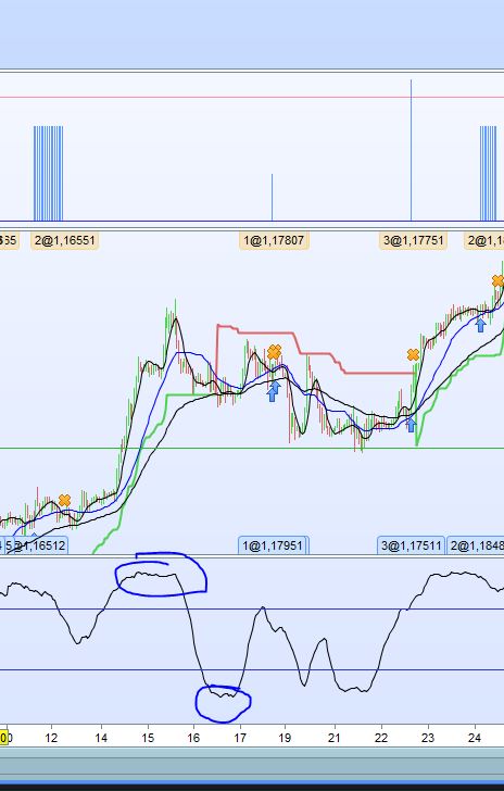 Hi everybody, i would to implement inside a trading sistem a code that can find the bottom of an oscillator like RSI or the Stock, but i don’t know how. As you can see in the photo some times when the indicator cross the like could be too late to start a trade, so i would find a solution someone can help me? i tried to write something like this, but is very rudimental: ////PARAMETRIC1 = RSI[7](close)C2 = RSI[7](Dclose(2))d1 = c2 < 30d2= c1 > 35IF C1 CROSSES OVER 30 and d1 and d2 and not daysForbiddenEntry thenBUY PositionSize CONTRACT AT MARKETENDIF