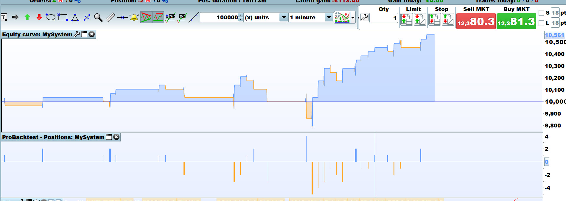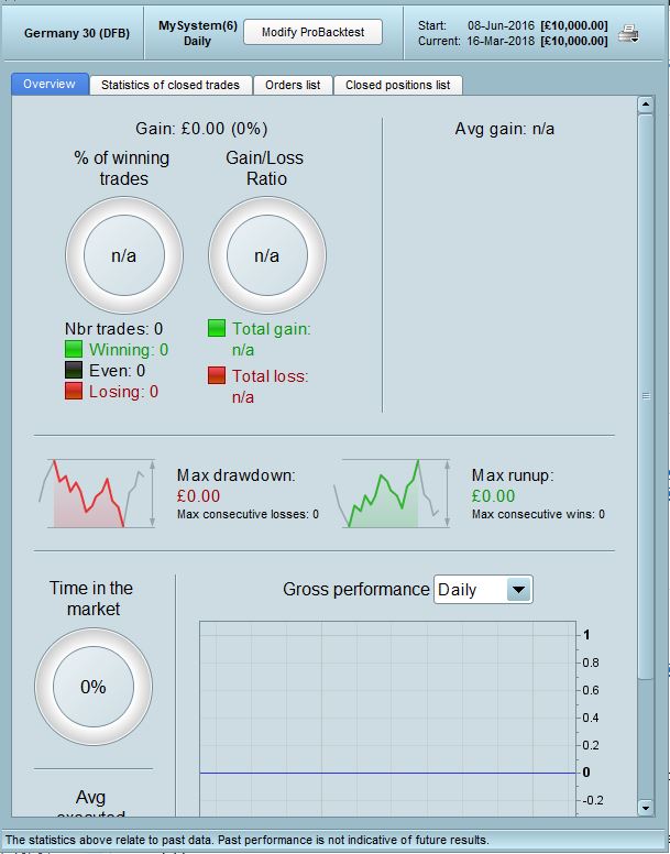 I know I must be doing something stupid but I just cant get any of the strategies to show me any backtest results. First of all I go to an open chart, say DAX, and click the drop down menu next to the button with a chart and a plus next to it. On the Backtesting & automatic trading tab, I then click new, then select the “Creation by programming” tab and paste in the copied code. Finally I click “ProBacktest my strategy.
