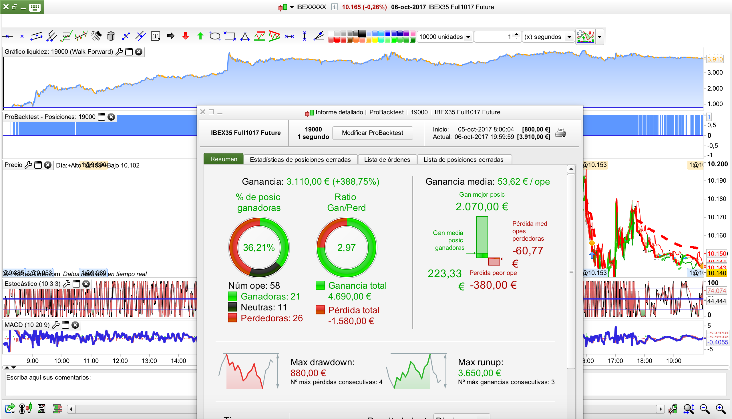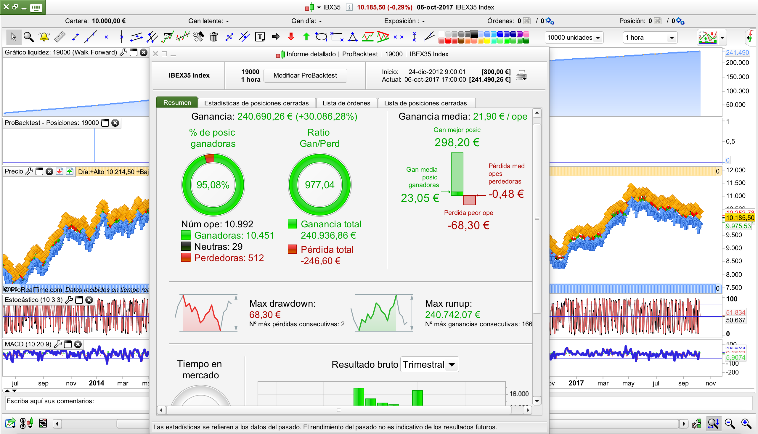 Hola a todos, es la primera vez que programo un automatismo de estos con prt y quería saber la opinión de los expertos..me arroja unos resultados que no son para nada normales a mi entender…una rentabilidad muy alta…demasiado alta y no se si es un bug del programa o que falla…lo he probado en todas las temporalidades y hasta 100000 unidades.Capital inicial 800 euros y final dependiendo de la temporalidad.Adjunto algunas imagenes.