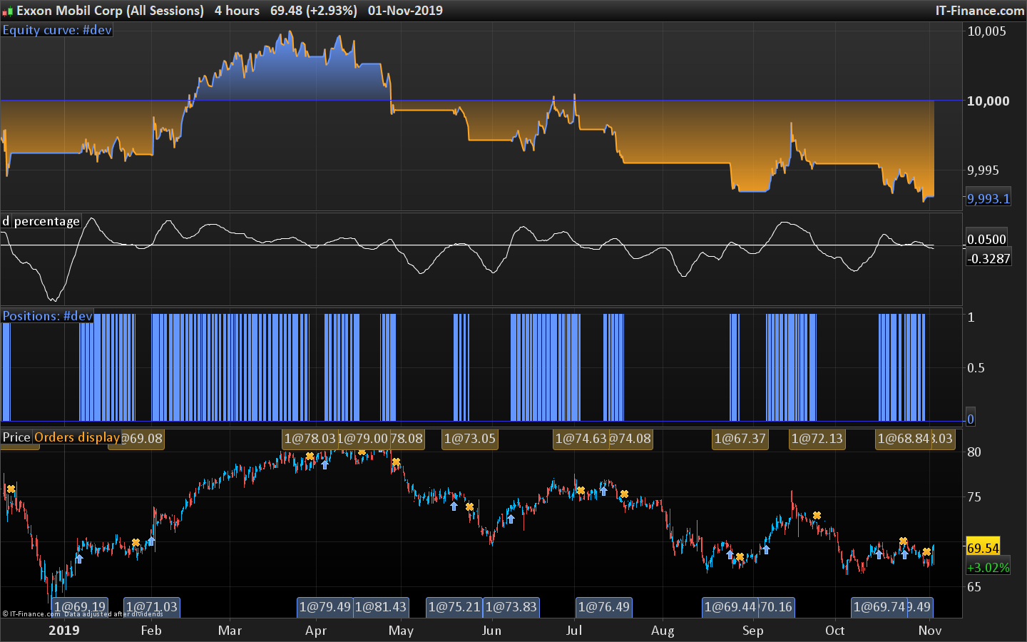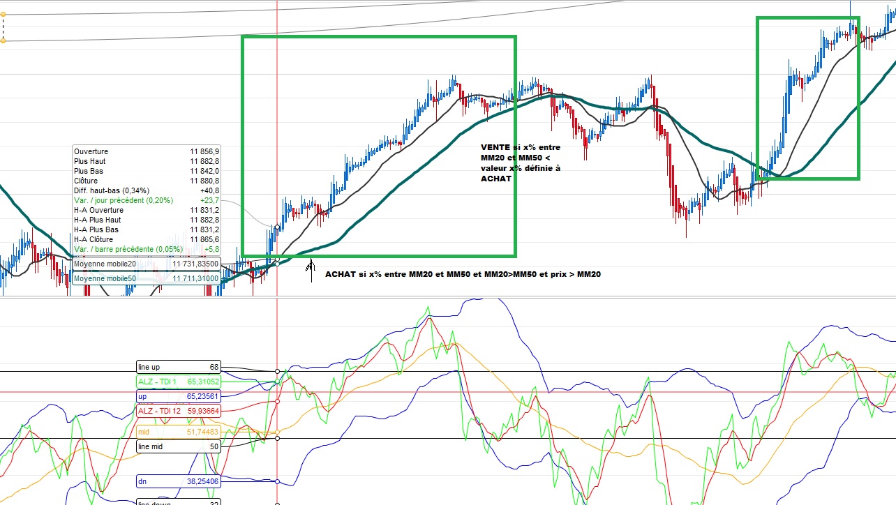 Dans le backtest, j’ai ajouté l’oscillateur de pourcentage entre la MM20 et la MM50, ainsi que le seuil à dépasser (ligne horizontale) pour initier un achat.