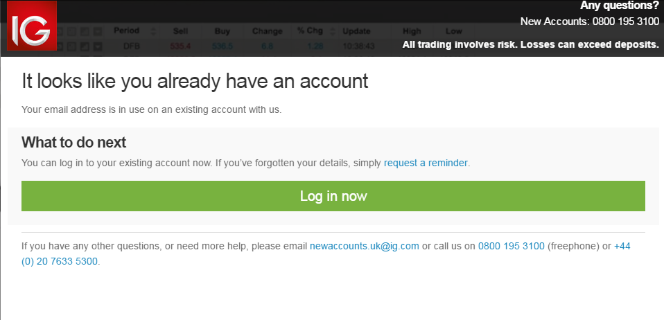 Well, I was redirected to IG.com to create a new account, and it suggested the DK site instead of UK. That problem I had before, when trying to create a 2nd account..they will reject the application because I did it on UK site. It also recognized me as already having an account. I called IG again and now it was not allowed to have multiple account.. O_o Anyway lets see what happens.