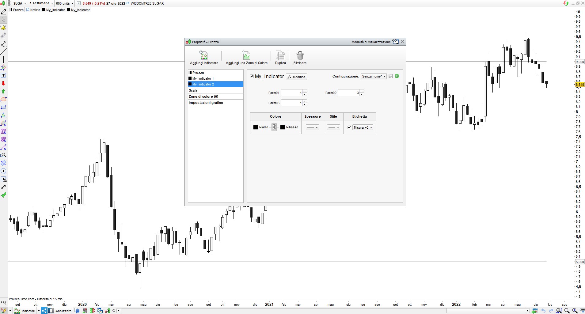 Allego questo esempio, nel grafico ho inserito due istanze dello stesso indicatore (My_Indicator) che prende tre parametri input (Parm01, Parm02, Parm03). Fino a questo pomeriggio i valori di ciascun parametro, che apparivano accanto al titolo dell’indicatore non si vedono più. Ho fatto qualche errore io? Potreste aiutarmi a farli apparire di nuovo?