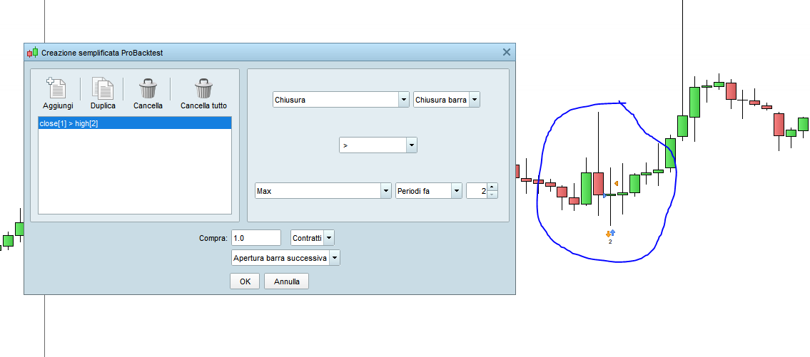 In questo esempio stabilisco che : LONG se la chiusura della candela è maggiore del massimo della candela precedente.