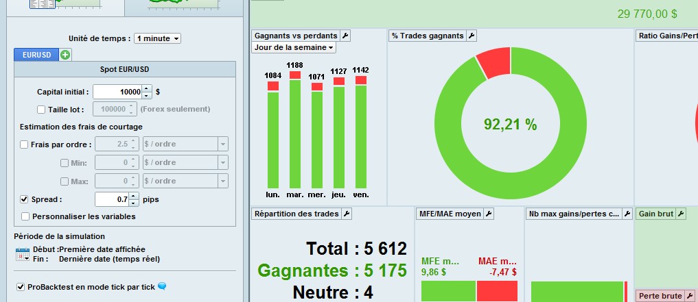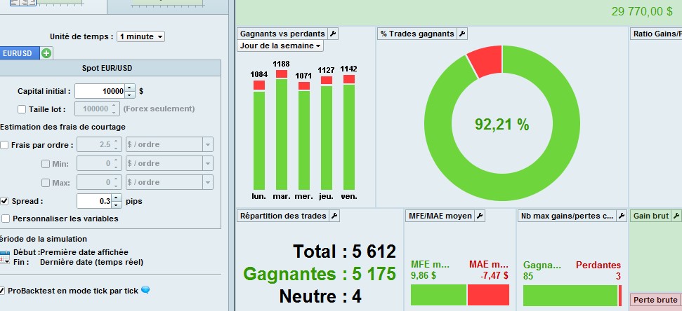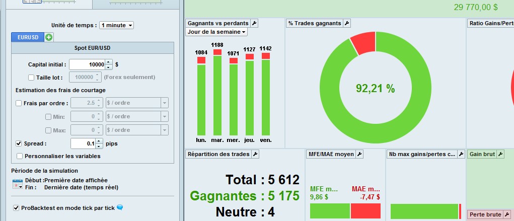 On EUR/USD as you can see, with spread 0.1, 0.3, 0.7 same result 29 770 USD