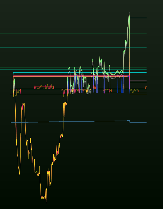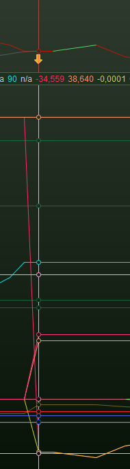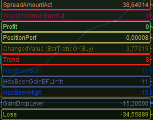 The drop in the yellow line, is the instant drop because of the denoted spread (my empirically found 1,9 for the desired 0,8 for my situation).