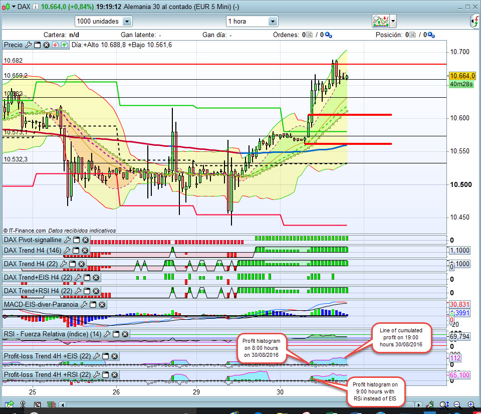 I am trying to improve the strategy of “Day-trading the DAX with the Trend” (http://www.prorealcode.com/prorealtime-trading-strategies/day-trading-dax-trend/), and built an indicator to see the profits per candle on every trade, and think on the possible changes on this strategy. I found a solution including the Elder Impulse System, operating if it is green or red (depending if it should be long or short), on the timeframe of 1 hour, starting on 8:00 and ending on 21.00 hours. It seems that normally the most profitable candles are between 9:00 and 11:00, but on the paper this indicator can be used between 8:00 and 21:00 hours with minimized losses.