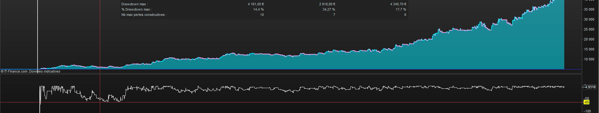 Pour être plus précis que la courbe d’équité de ProBacktest, je te suggère de “grapher” le drawdown, voir sujet: