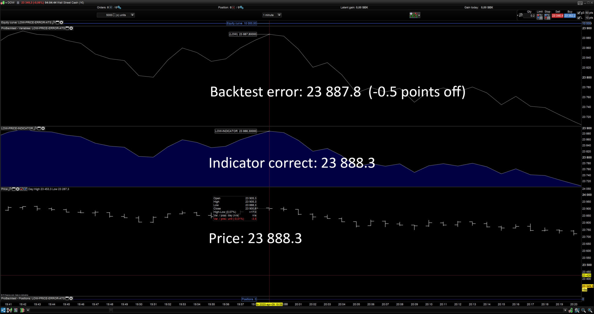However, although hundreds of bars (including the first ones) are identical, I still find errors between some bars – see the marked boxed zone. In this case it is the Dow on the 1 minute chart. Error is on the second decimal, so it’s not the critical, but it is highly peculiar. Math is math. So it shouldn’t. It’s shouldn’t be a rounding error as it should happen on both the ProBuilder and ProOrder.