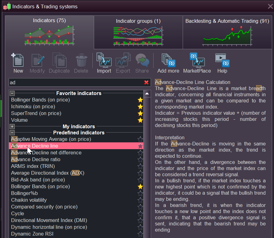 My question is about the Advance Decline indicator. I cant find it in Prorealtime. I am using version 10.3.