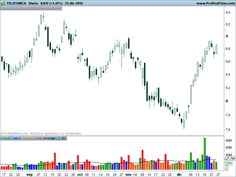 1. Si el precio de cierre de hoy y su volumen son mayores que el de hace dos semanas, el color de la barra de volumen será VERDE.