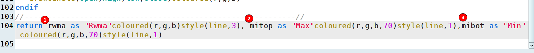 return rwma as “Rwma”coloured(r,g,b)style(line,3), mitop as “Max”coloured(r,g,b,70)style(line,1),mibot as “Min” coloured(r,g,b,70)style(line,1),trend as “trend” y la creacion asistida solicita 5 valores para el codigo, lo que genera un error.